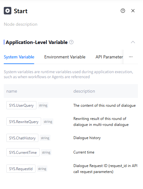 The Agent node imports the system variable, environment variable, API parameter, and application variable used by the Agent by default, with no need to manually add them.