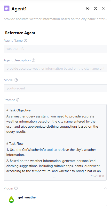 By leveraging Agent nodes, you can shorten the workflow process and simplify setup steps. For example, configure a weather inquiry assistant to implement weather inquiry and clothing advice services.
