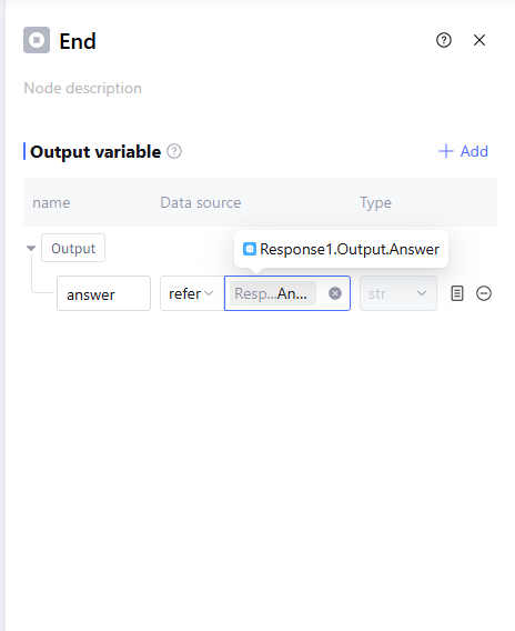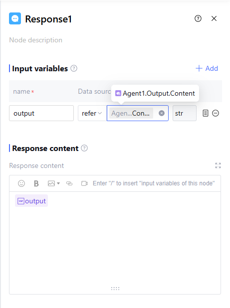 Reply Node directly references the output content of the preceding Agent node, passing the Agent node's output variable Output.Content as the reply content to the end node.