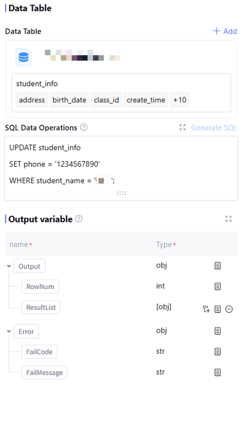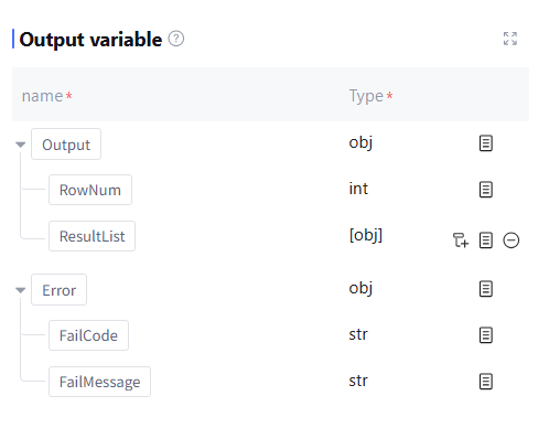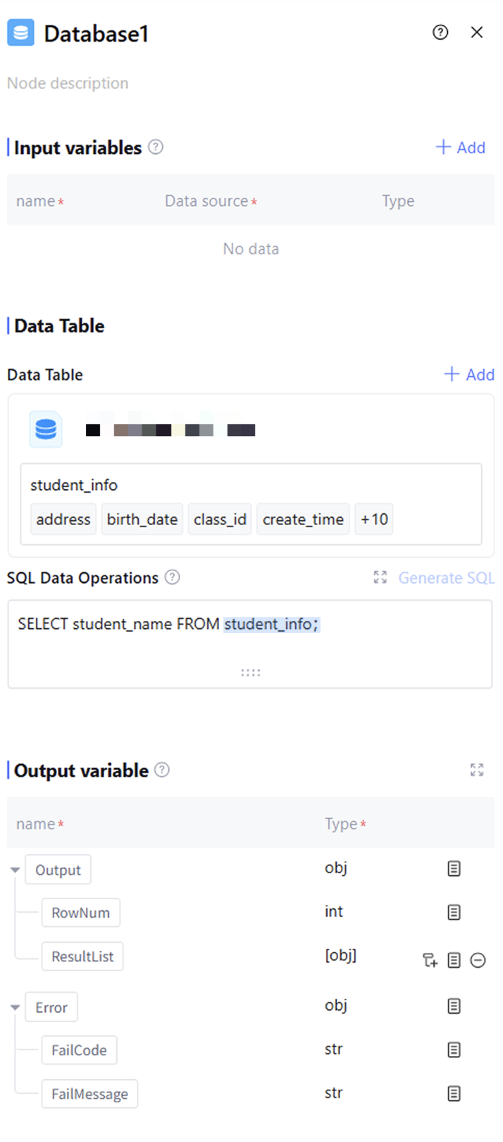 The output variable processed by this node includes the number of rows in the data table, the post-operation data result ResultList (data type: array<object>), as well as runtime Error info (data type: object, this field is empty during normal operation). Users can manually add required output variables in ResultList based on SQL operations.