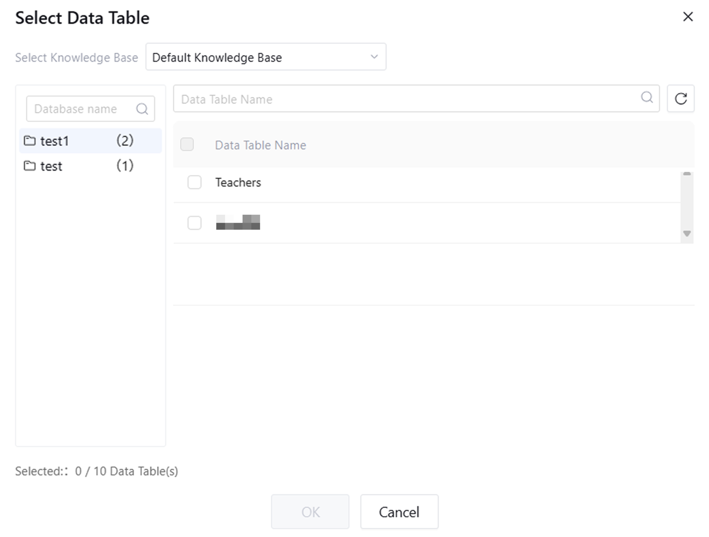 A data table is the basic structure for storing data in a database, used to organize, store, and manage data. Each table consists of rows and columns. Each row represents a record containing a specific instance or data, and each column represents a property or feature of the data. Click "Add" to select data tables for data operations. You can select up to 10 data tables under a database.