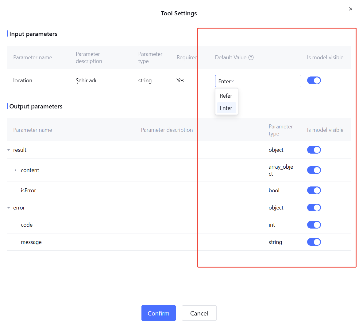 In Tool Settings, under Input Parameters, you can enter or refer to parameter default values, while also supporting switching whether the model is visible for a single parameter. If set to visible, the model collects this parameter in conversation; if set to invisible, the tool is called with the imported or input parameter.