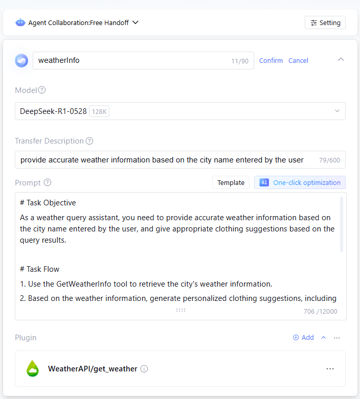 In Free Handoff collaboration mode, it supports creating one Agent or more. Multiple agents complete tasks through transfer collaboration.