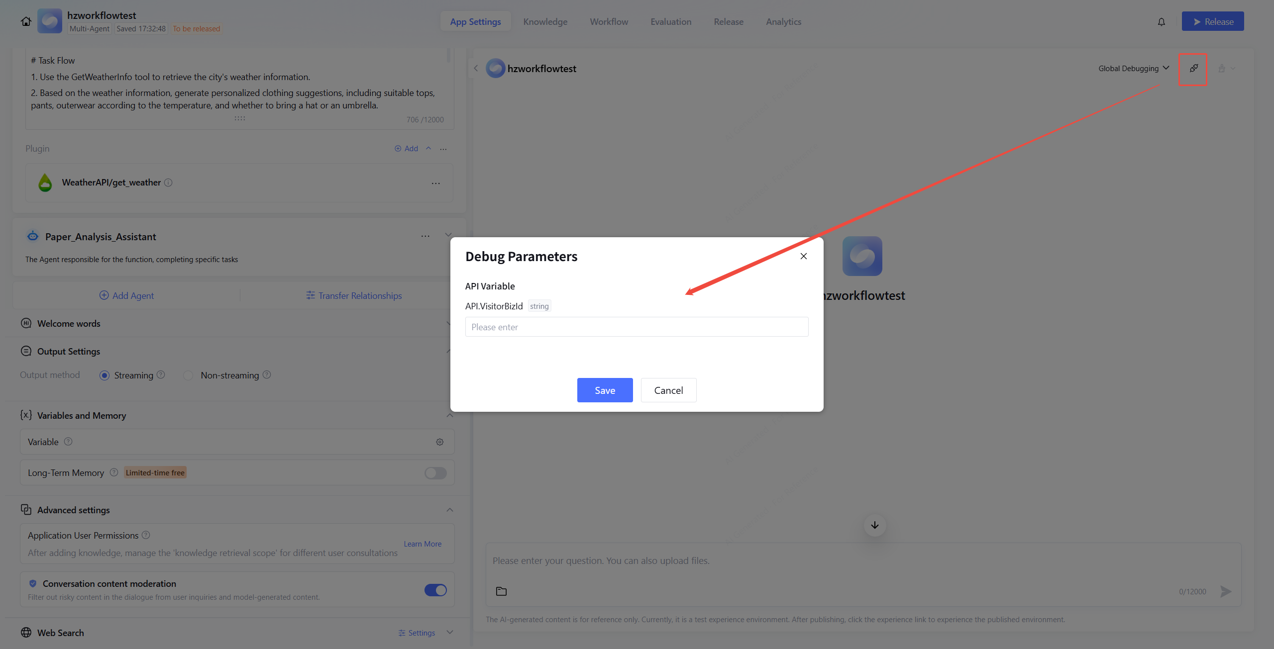 The debugging parameters in the top-right corner of the debug dialog box support direct configuration of custom API parameter values, making it easy to perform Agent feature debugging.