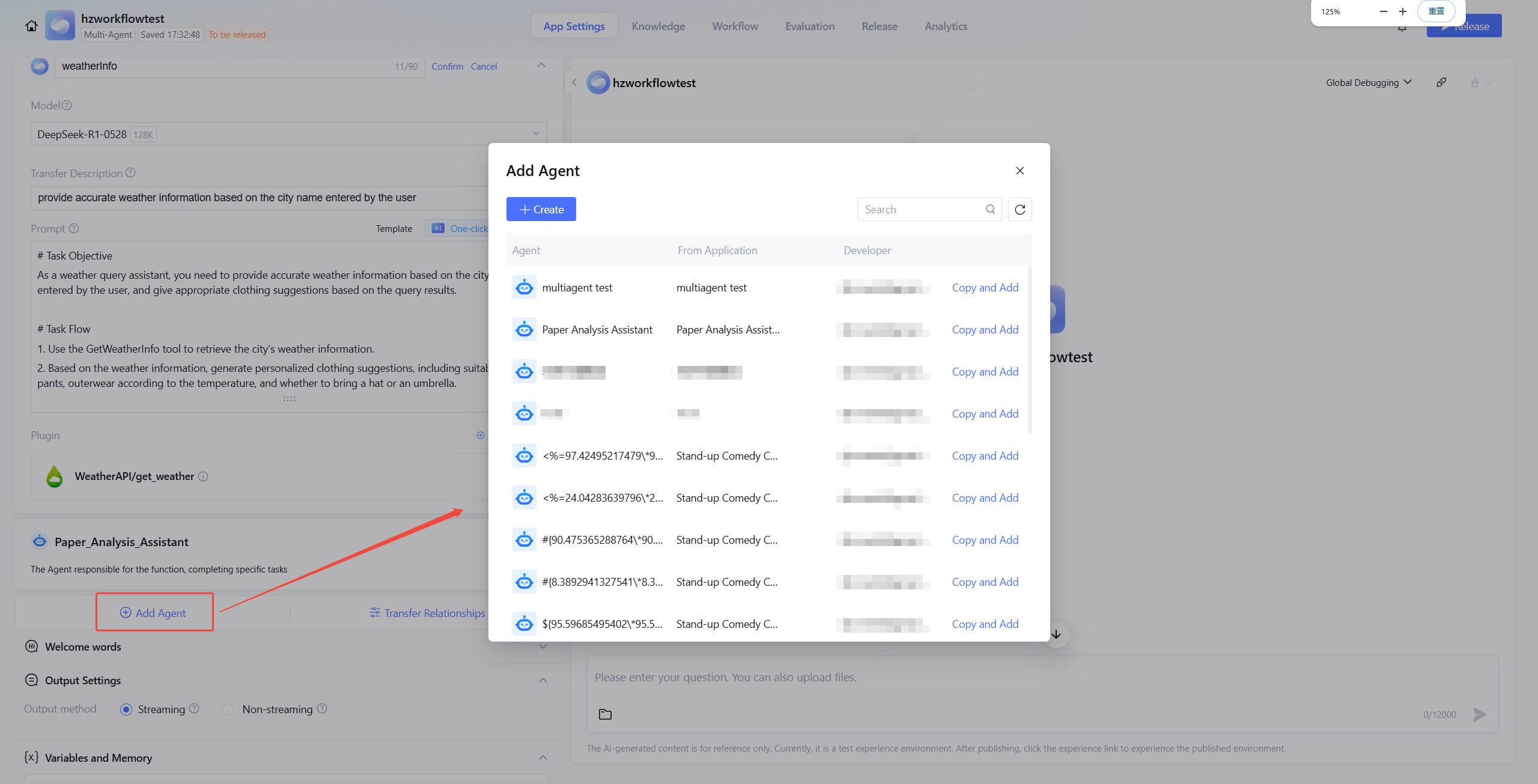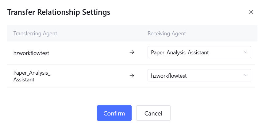 When adding two or more Agents in the application, the system supports configuring transfer relationships between multiple Agents. Please note, by default, these Agents will not take effect immediately after creation. The Main Agent can accurately allocate dialogues to specific sub-Agents based on "Agent description" only after establishing transfer relationships with them. If a sub-Agent fails to establish an association with the Main Agent through transfer relationships (which can be single-layer or multi-layer), it will be deemed as in a free status and cannot be activated for use.
