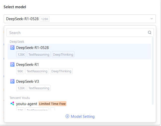 The model in the Agent is used for task planning and tool selection, supporting model selection as needed.
