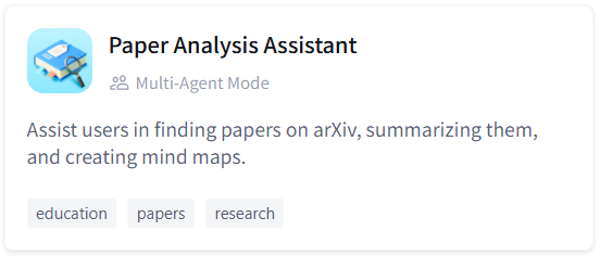 The application card shows the avatar, name, application mode, application description, and enhanced info of the application. Among them, the enhanced info helps users gain a preliminary understanding of the key points of the application template, making it easy to intuitively understand and filter applications.