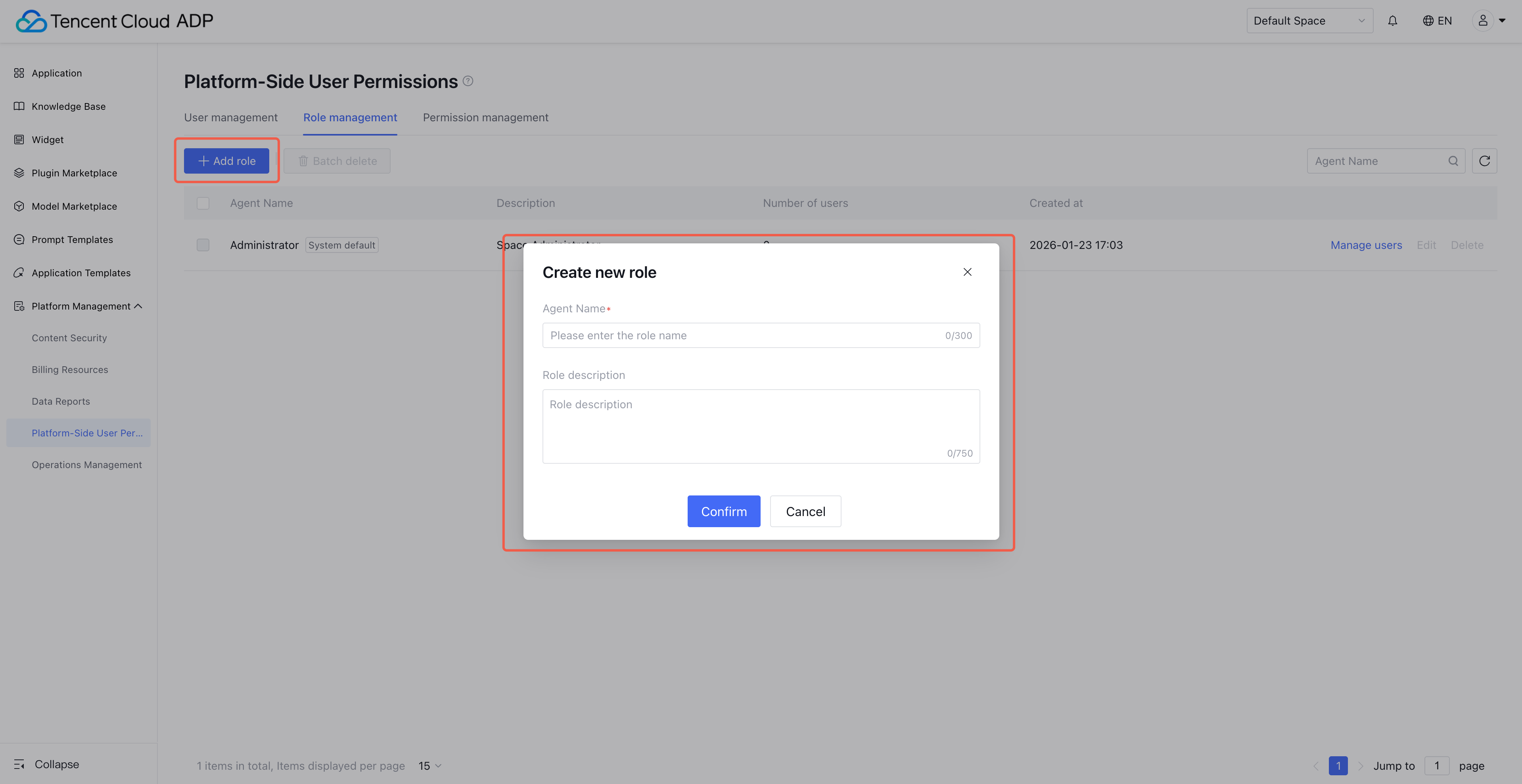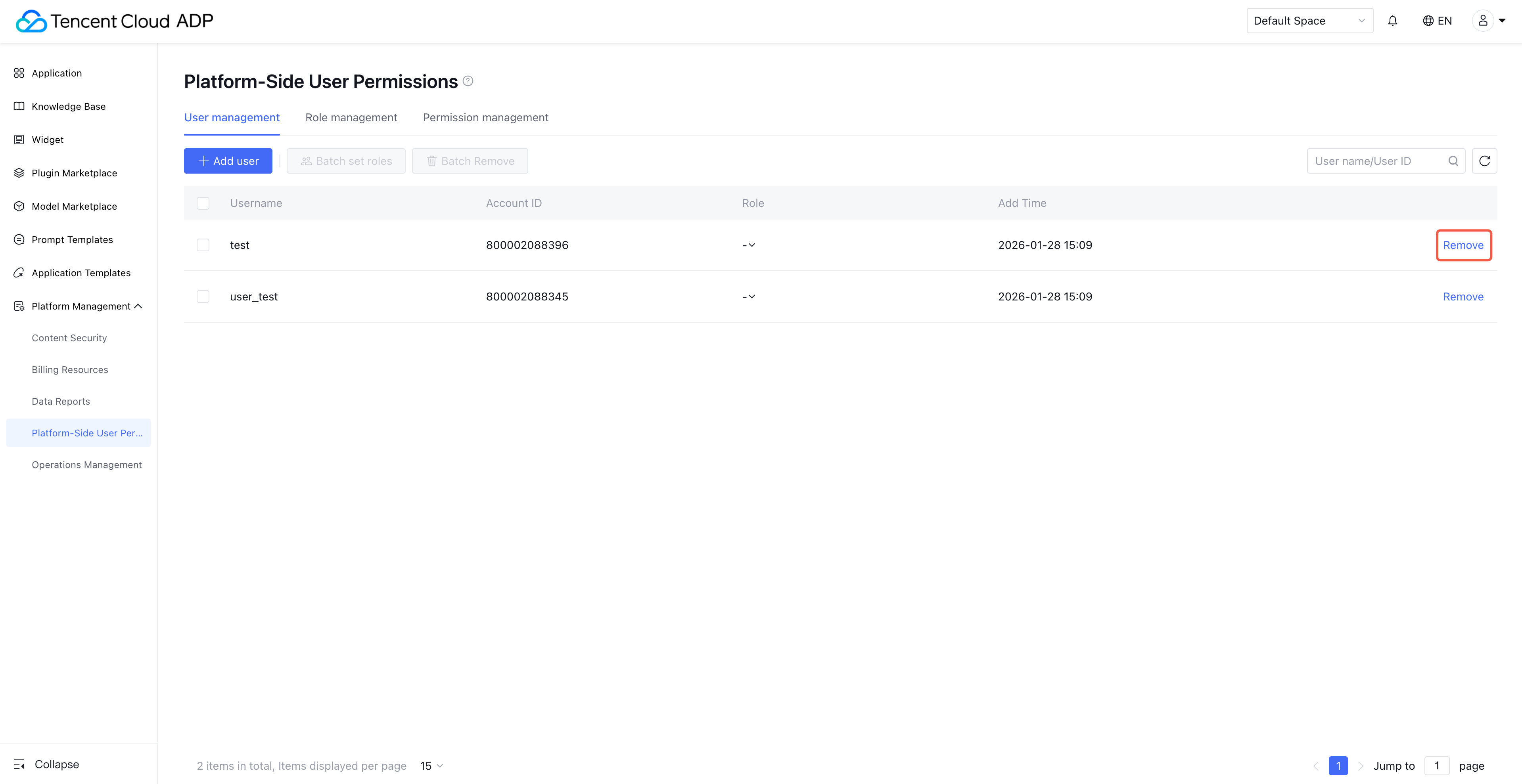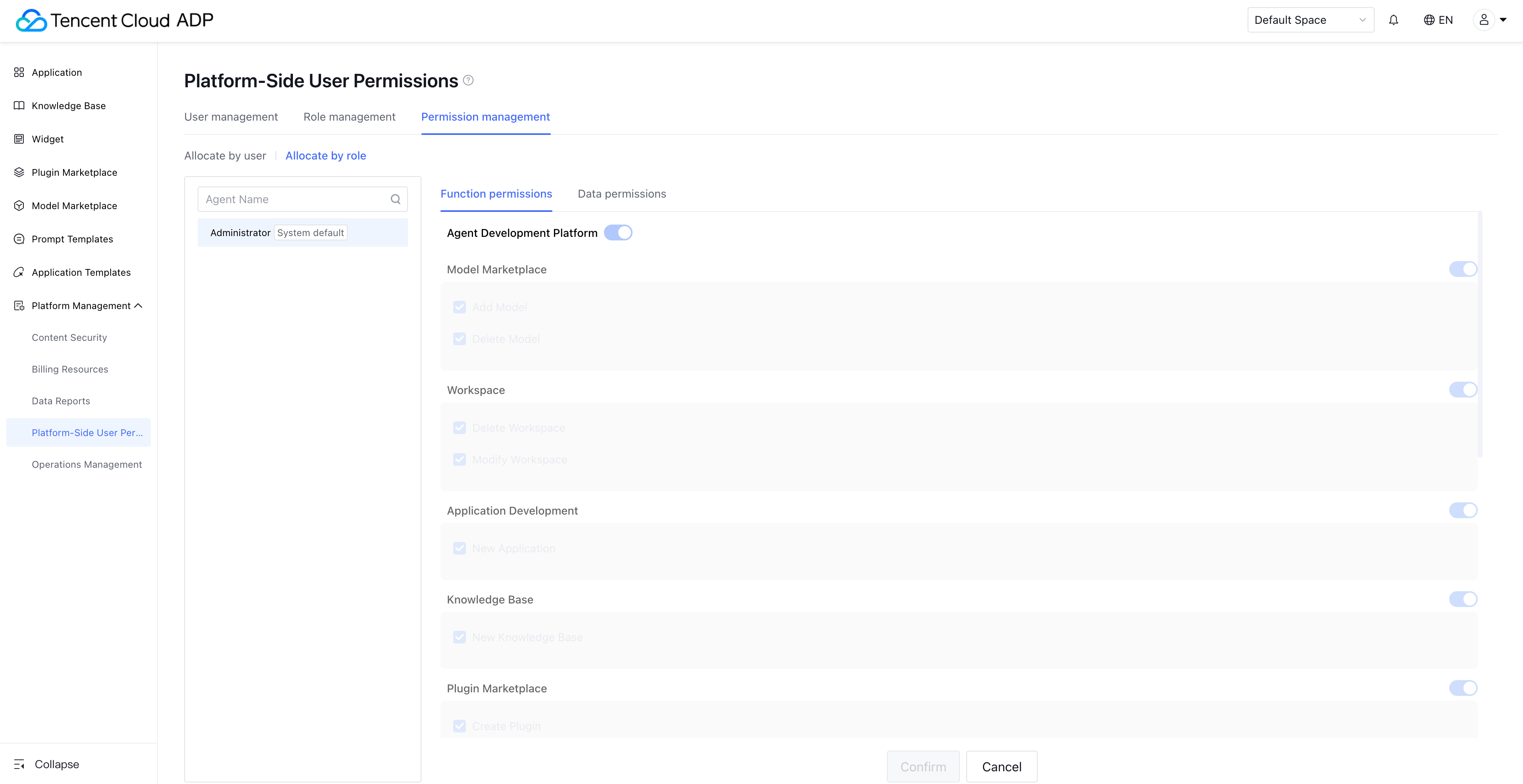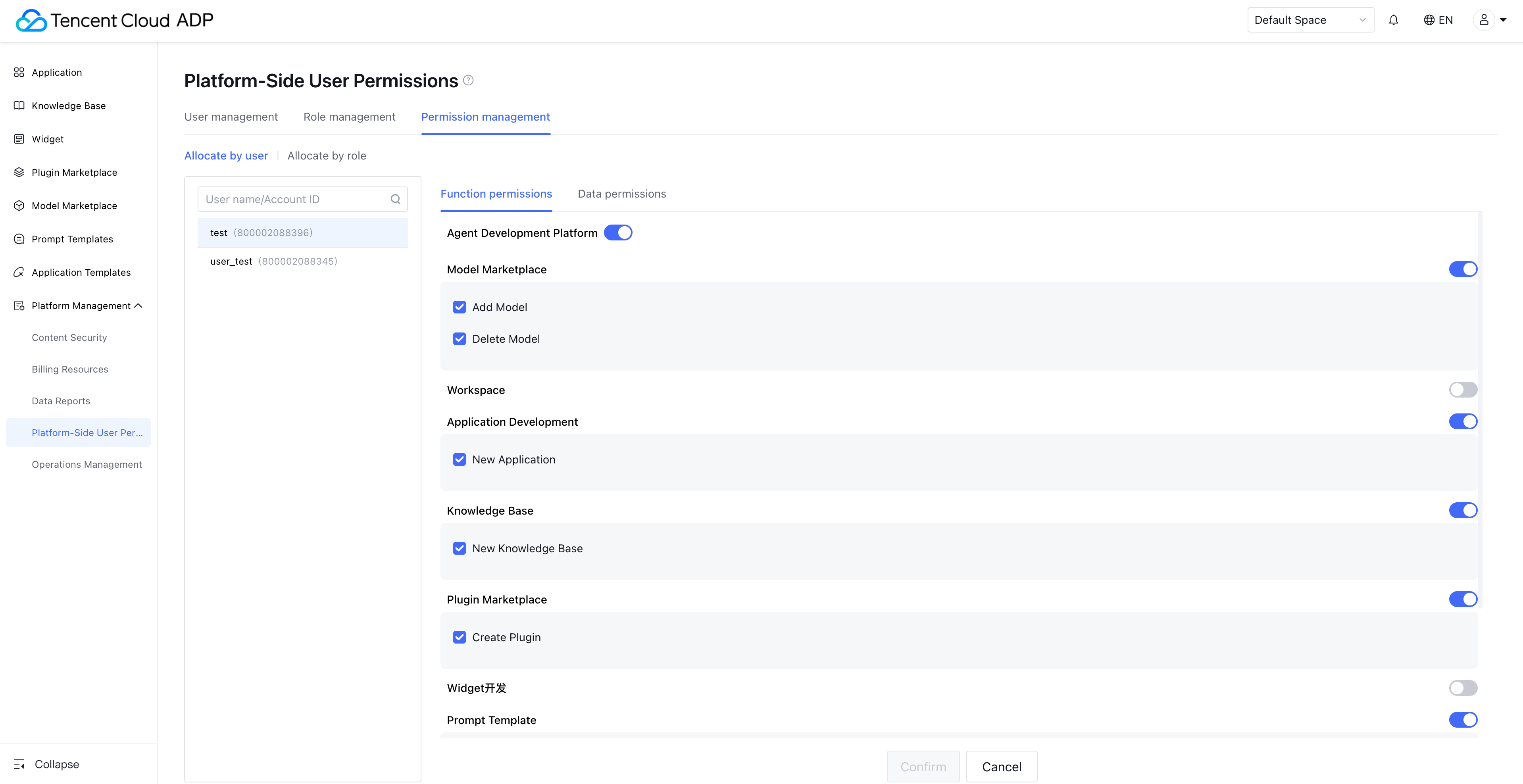 Platform-side user permissions are workspace-level functions, allowing each workspace to independently control permissions of its members. This feature includes three components: User Management, Role Management, and Permission Management.
