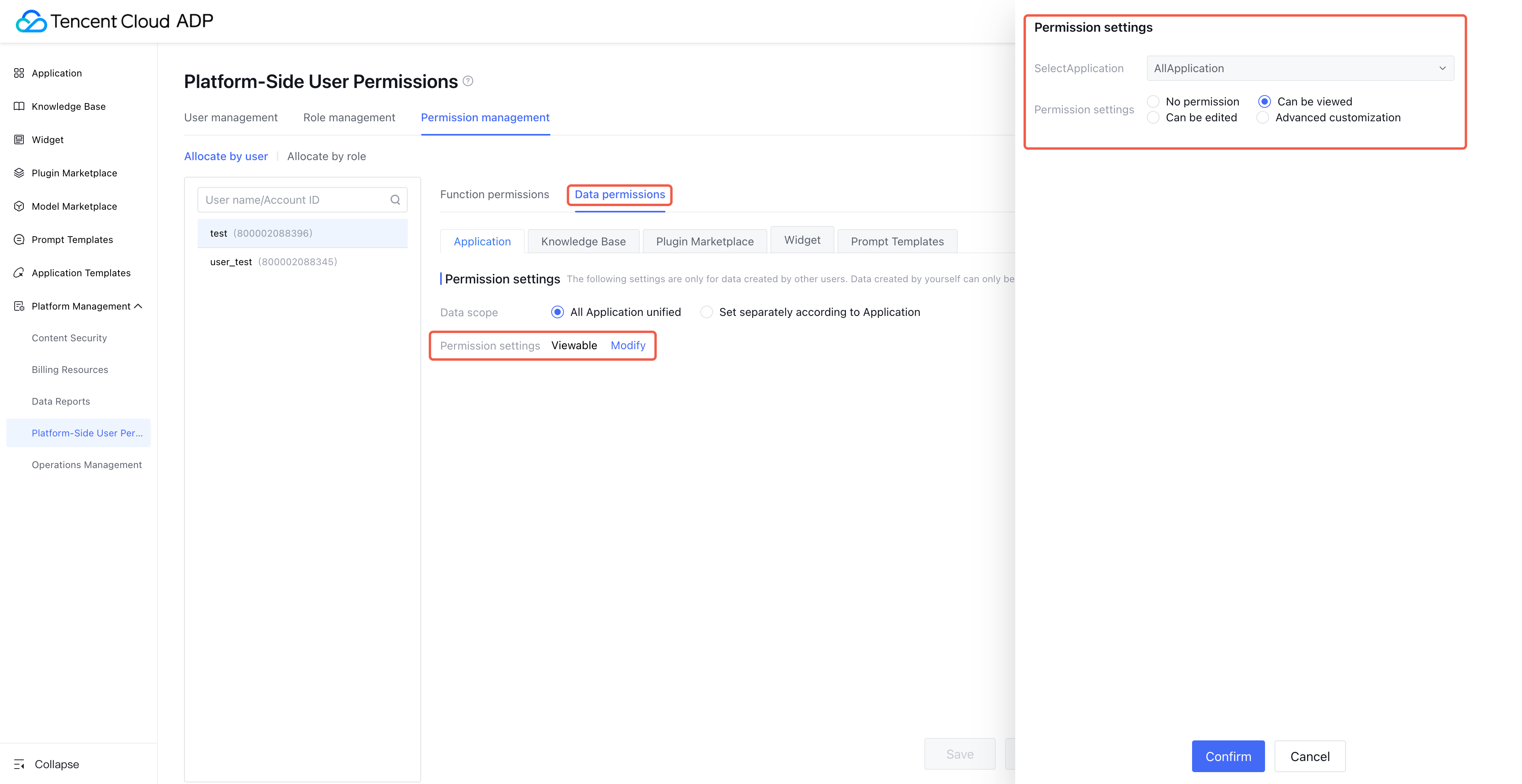 Data permissions: Data permissions control which data a workspace member can view or edit within the current workspace. Supported objects include applications, knowledge bases, plugins, and prompt templates.