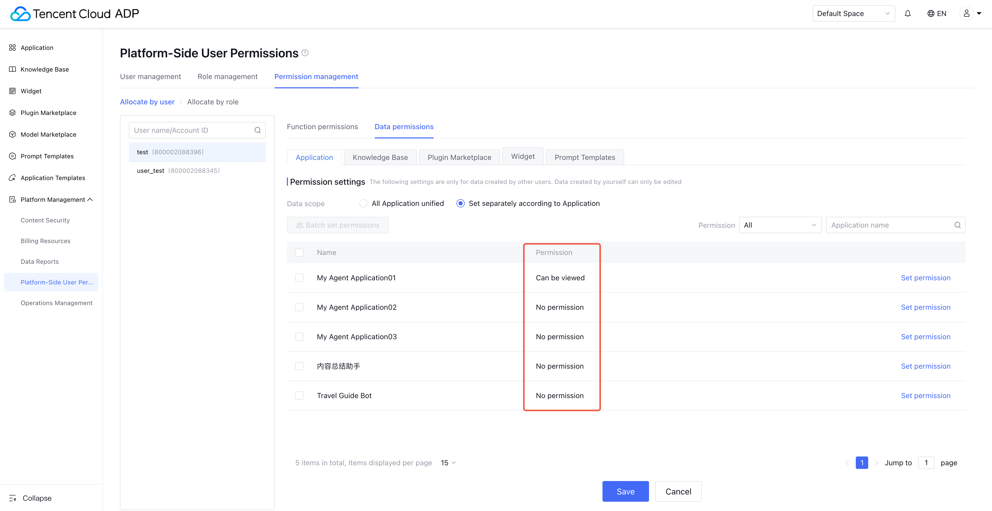 viewable | User can view the data. For example, if User 1 has view permission for “ds test application,” they can open and test it in the dialogue interface but cannot edit. |