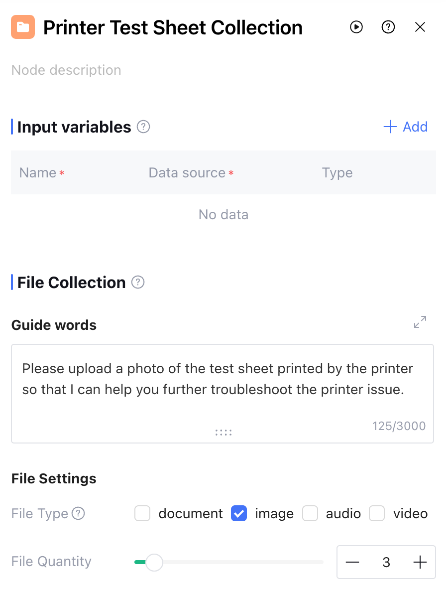 Support guidance for file collection to ask or prompt user what kind of file to upload. The prompt input box supports referencing the node's input variable by entering "/".