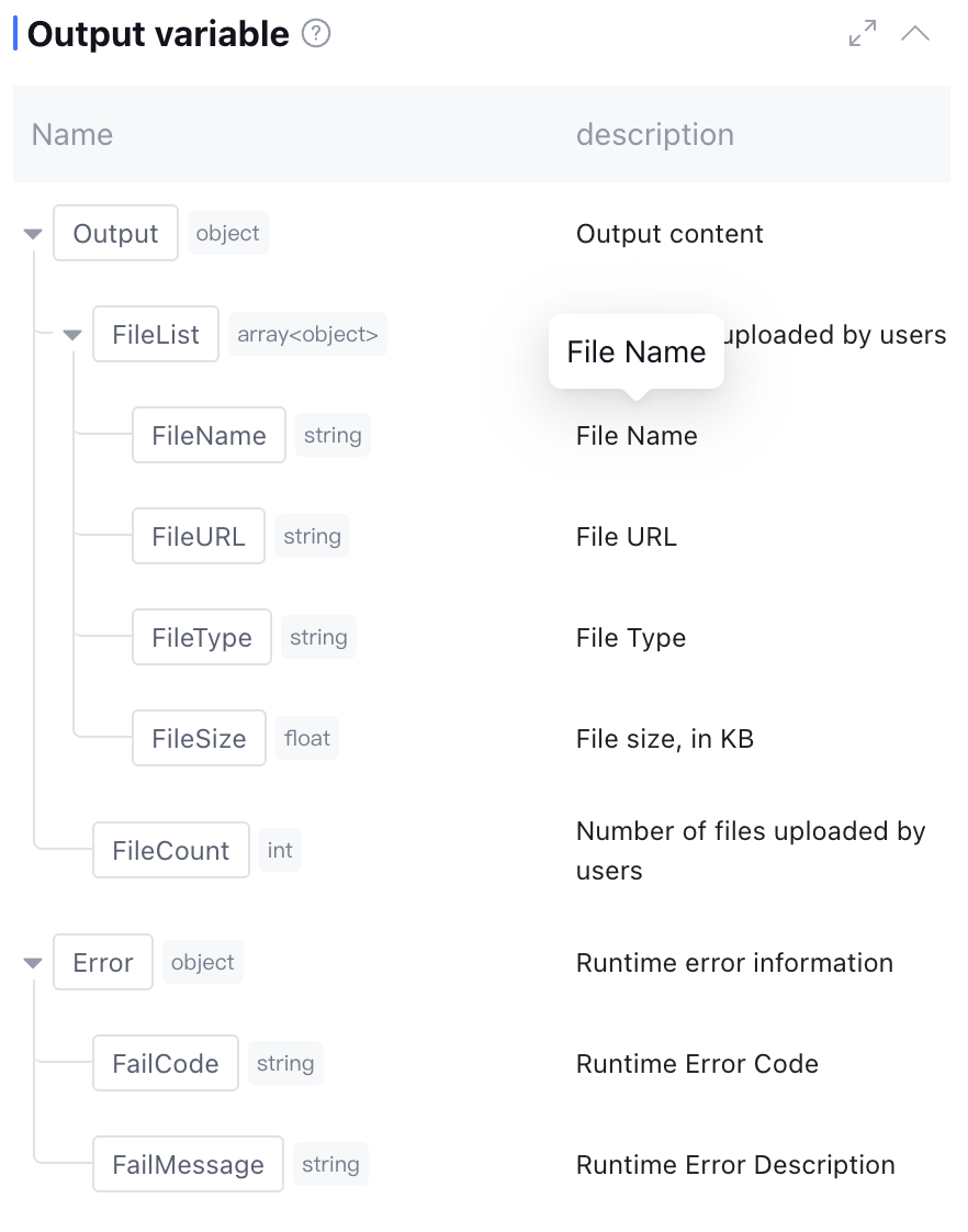 The node contains two output variables: one is the file list collected by the node (including the file name, address, type, and size), and the other is the runtime Error info (data type: object, this field is empty during normal operation). Manually add is not supported.