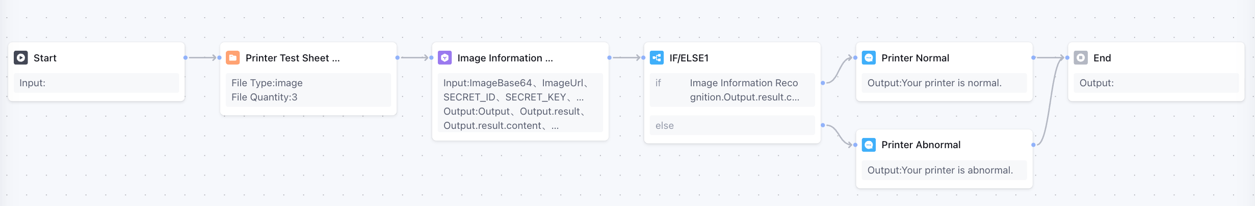 In the printer troubleshooting scenario, collect photos of printer test paper by setting a file collection node, then use the image recognition plug-in to identify the printing paper content, thereby judging whether the printer is functioning normally.