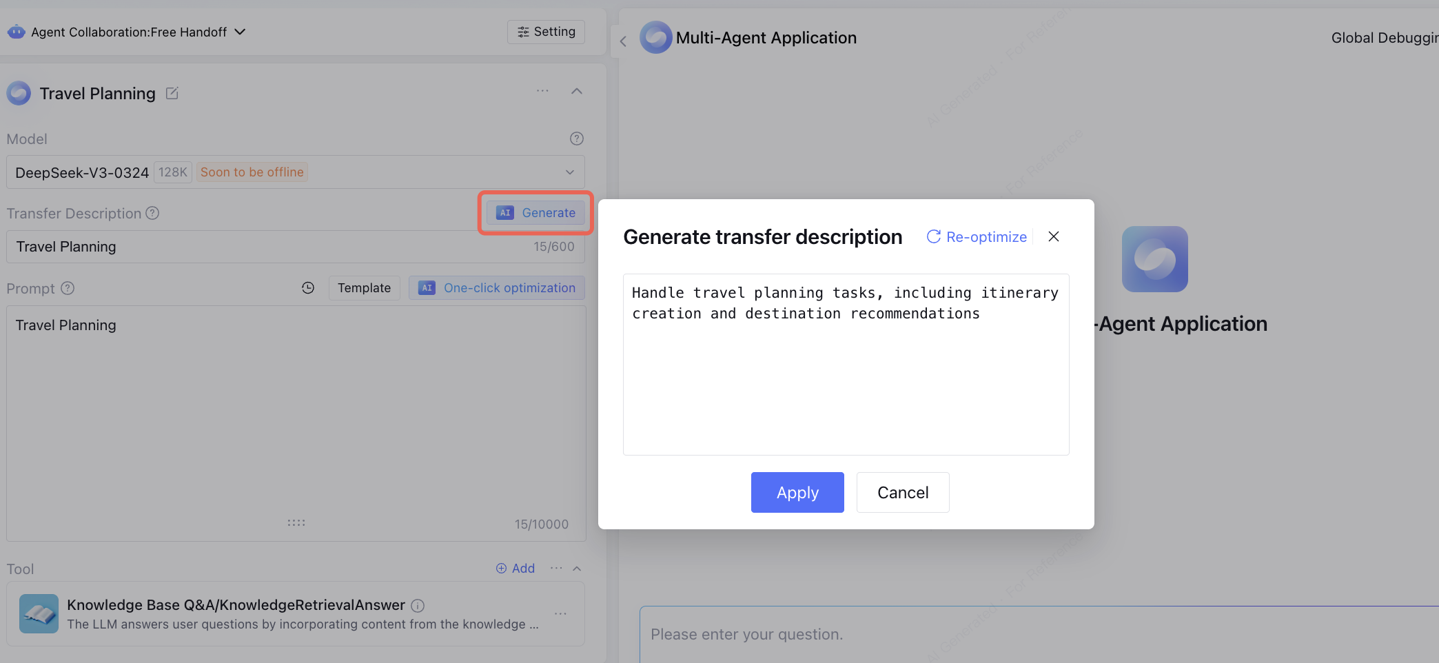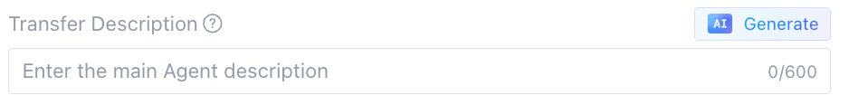 If configuring a single Agent usage scenario, you can simply fill in the transfer description. But in multi-Agent collaboration scenarios, clear descriptions are critical for correct transfer.