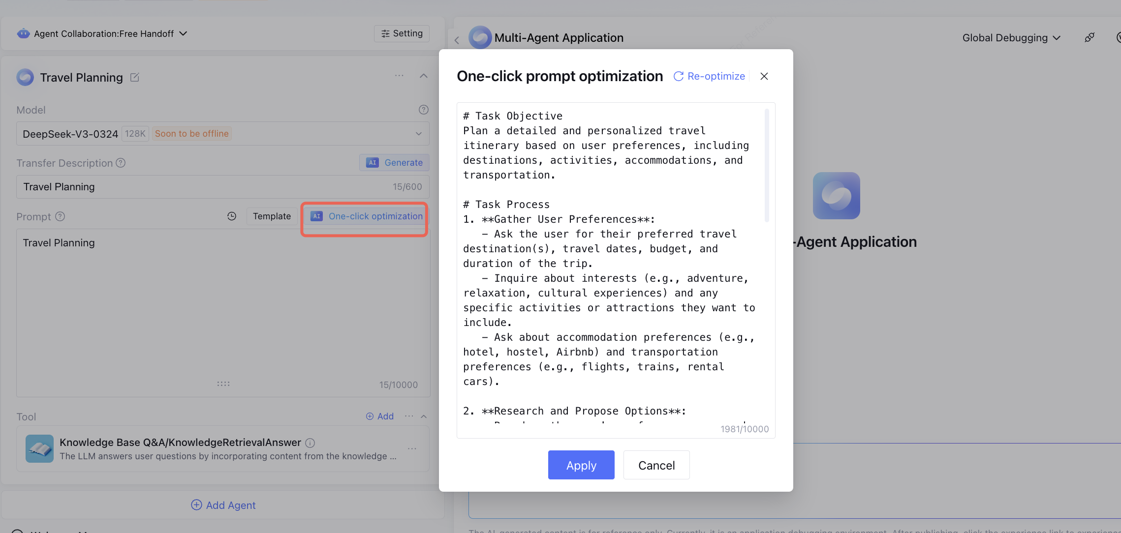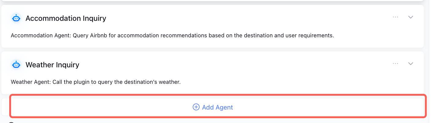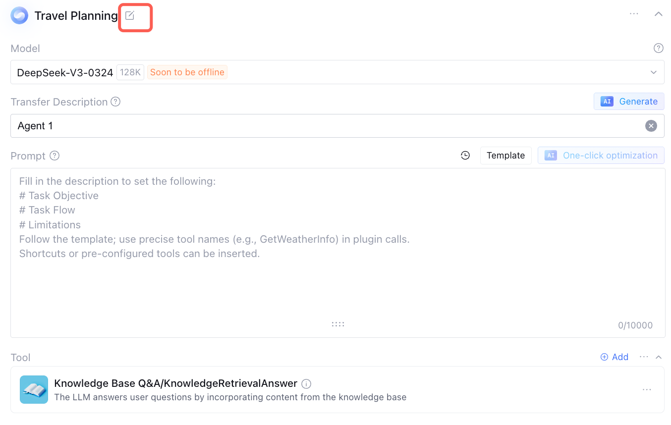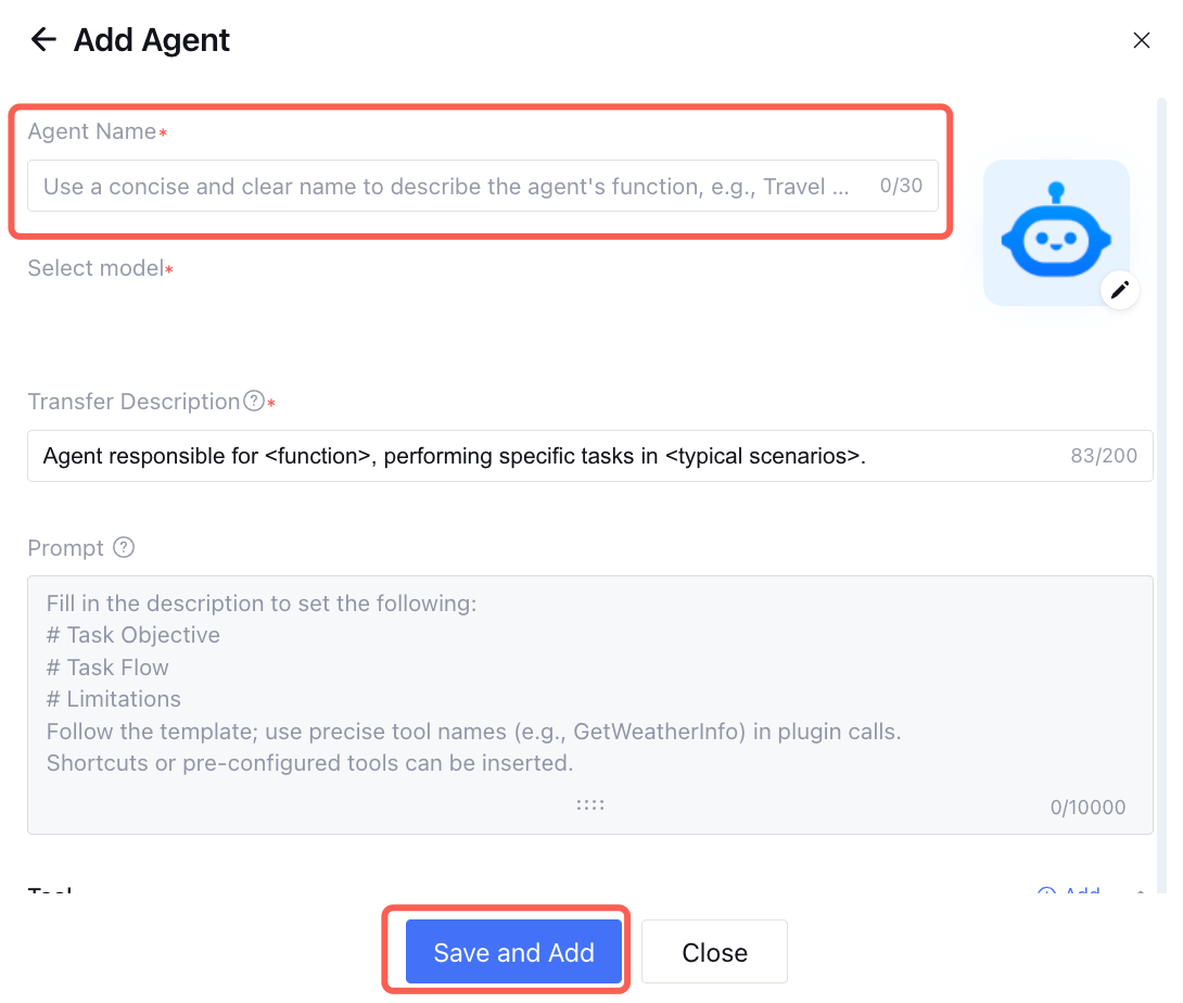 For single-Agent apps, a neutral name is fine. For Multi-Agent apps, both the agent name and description are key information for task transfer. Use simple, meaningful names to describe agent features, such as Travel Planning Assistant, Web Page Analytics Agent, or Copywriting Optimization Agent.