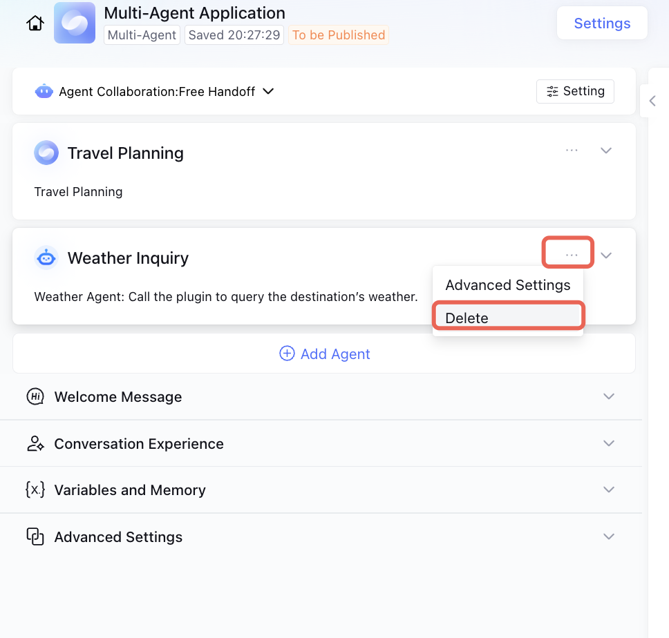 You can also implement refined tuning of the Agent by configuring application variables, long-term memory, as well as features such as synonyms in advanced settings. For configuration methods and functions, refer to Application Settings Overview. Delete Agent