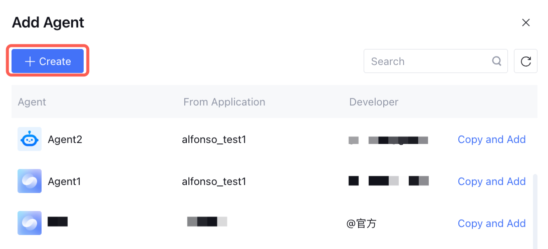 You can also click Create, fill in the Agent name and transfer description to create a new Agent.