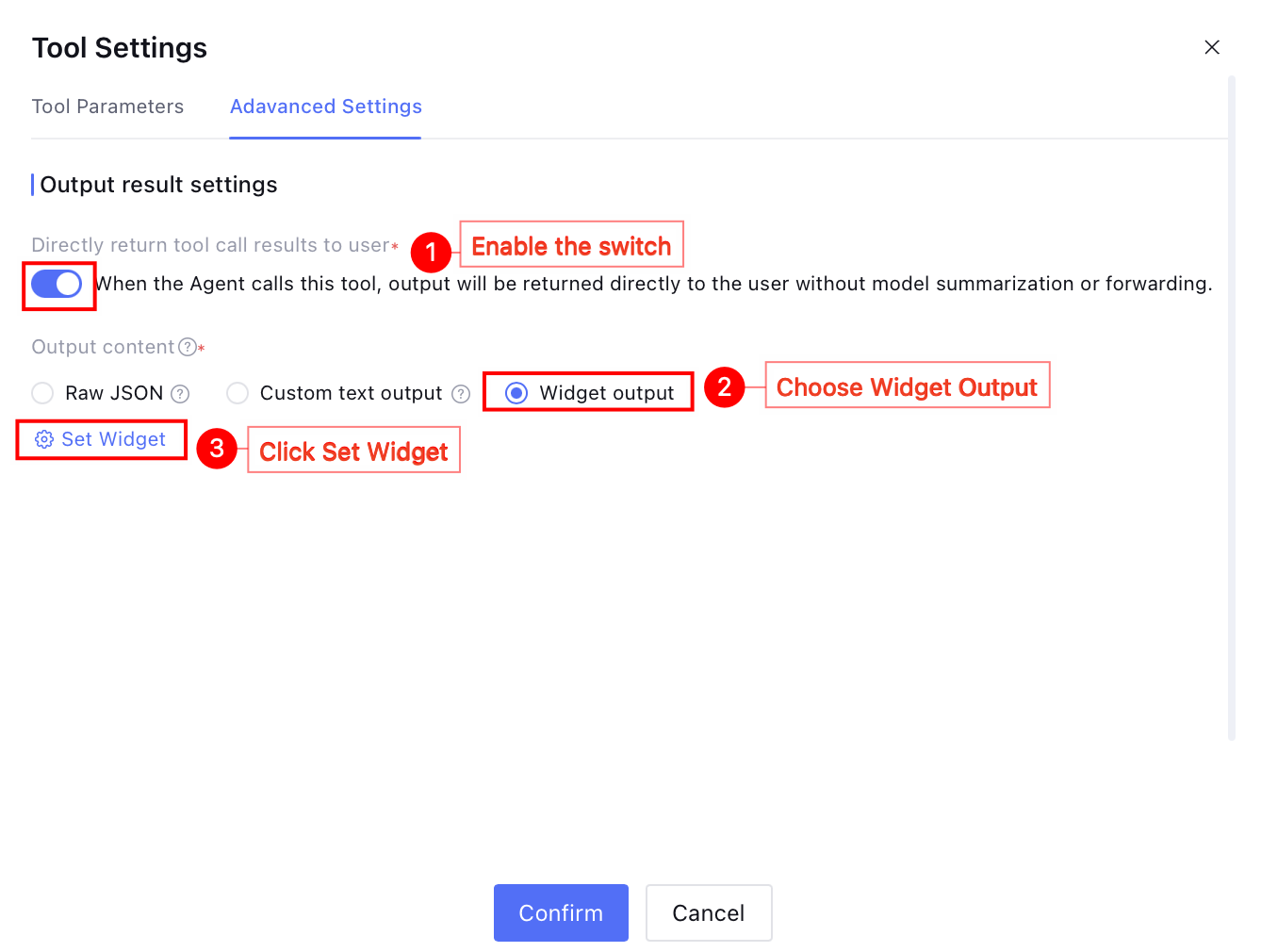 After enabling tool call to directly output Widget, the result will be returned and rendered at one time, with no support for streaming output. Therefore, it is not suitable for showing large consecutive text content. Recommend using it for tool output scenarios with clear and stable structure.