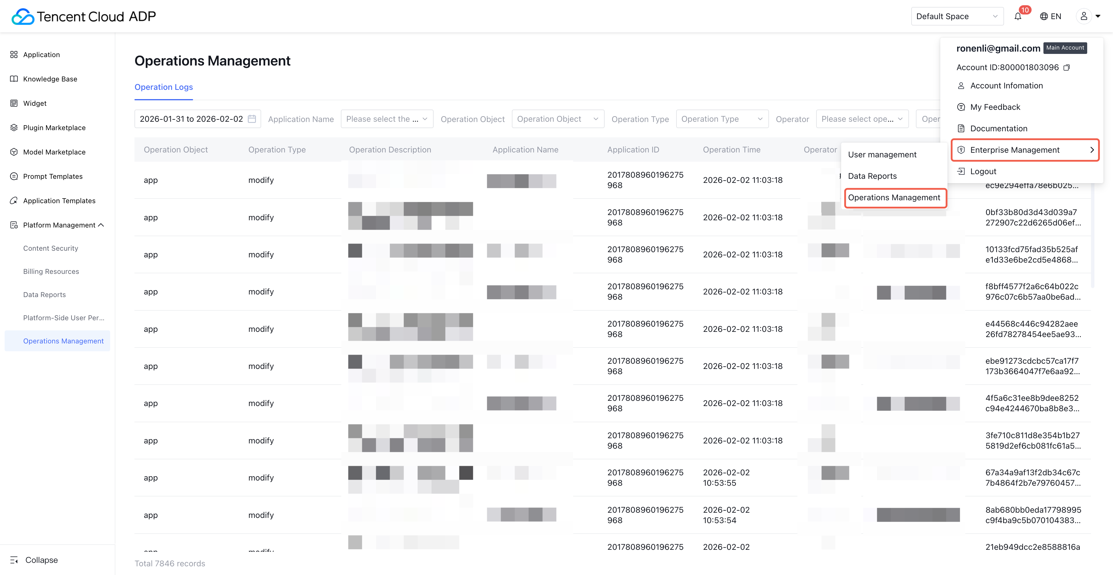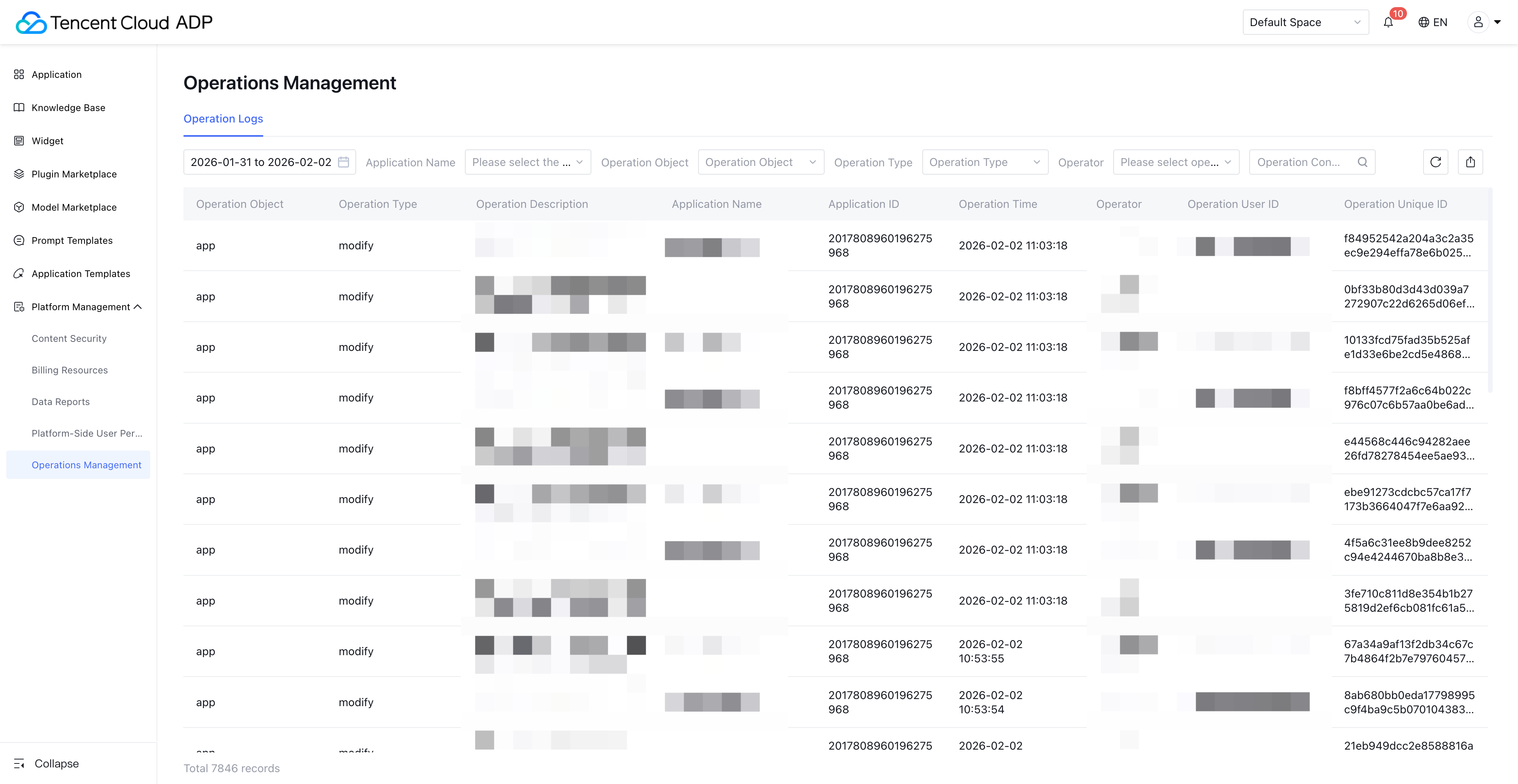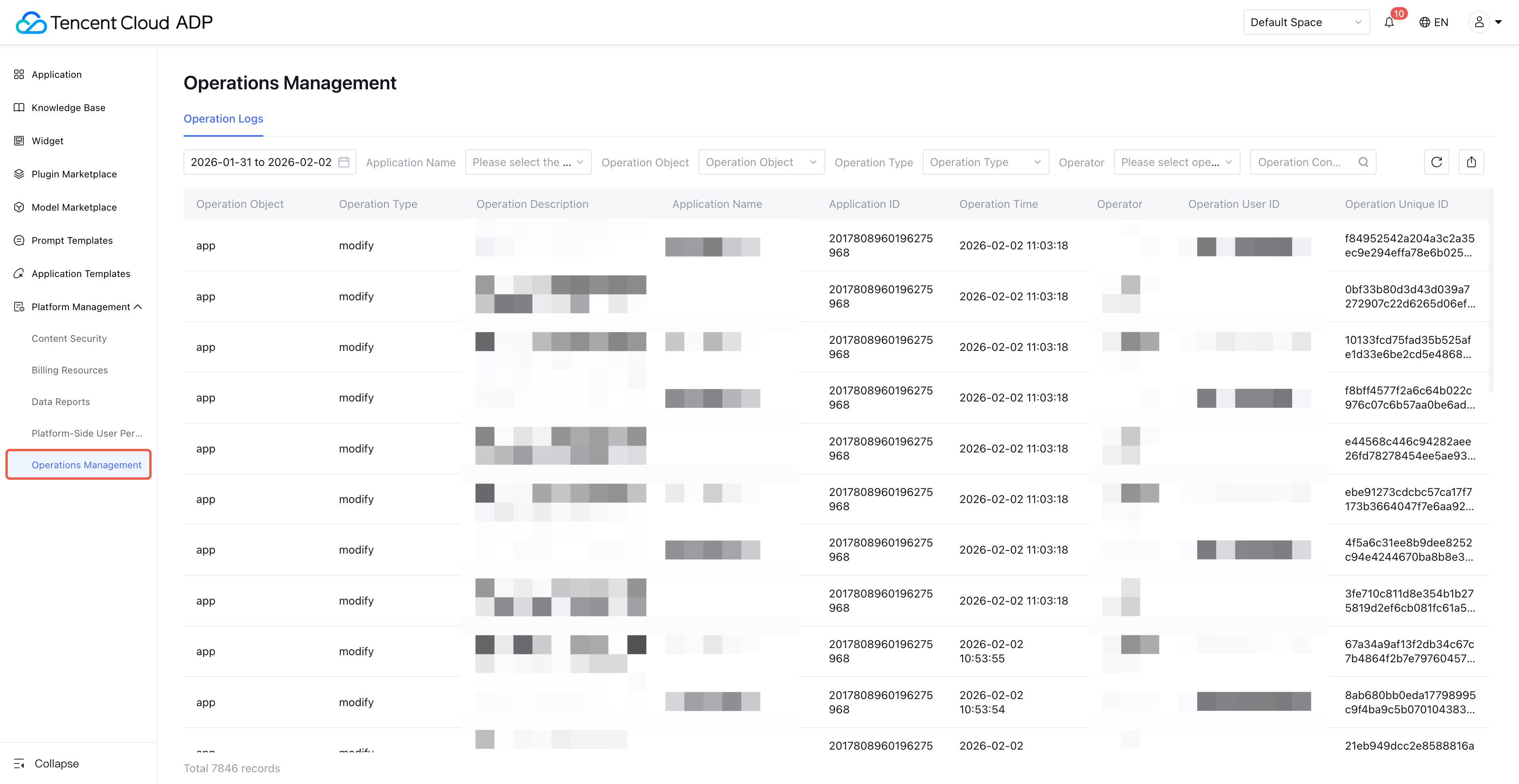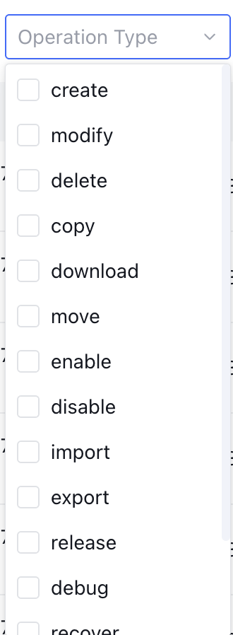 Operation Type | Support filtering, enumeration values contained as follows: create: file inclusion import. modify: Edit corresponding content, including batch edit operations such as batch adjust document validity time. copy: for example, application development copy. download: including batch download action. move: move an asset to the corresponding category. enable: enable assets such as documents and QA. disable: disable assets such as documents and QA. import: document import for the knowledge base. export: export report data. release: publish application. debug: debug a specific node in the workflow or debug the entire workflow operation. recover: restore assets such as documents and QA. collect: prompt template collection. uncollect: unfavorite prompt template. | Support drop-down selection of operation type, multiple selection ![]() | Yes | Yes |