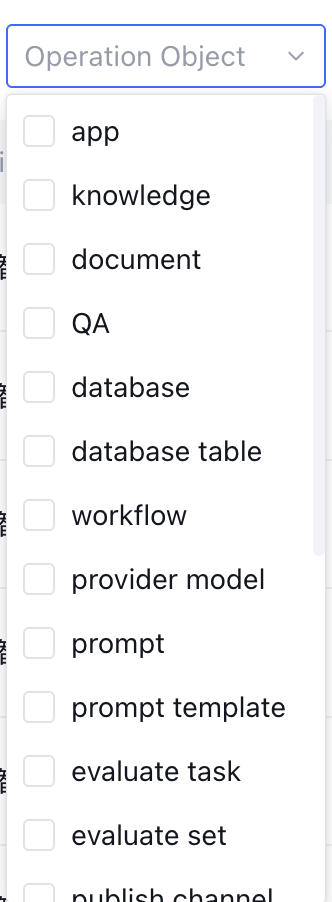 Object | Operation objects include: app knowledge document QA database database table workflow provider model prompt prompt template evaluate task evaluate set publish channel user permission plugin data analysis chat logs reject question unsatisfactory question finance operation | Support drop-down selection of operation object, multiple selection ![]() | Yes | Yes |