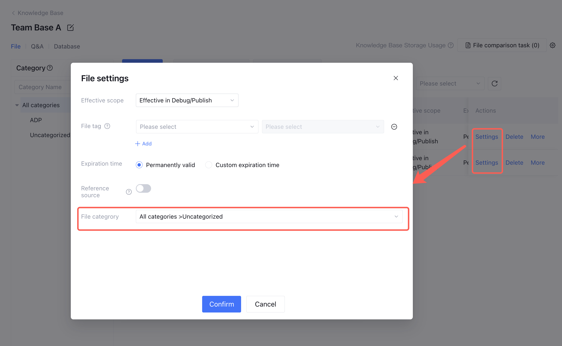 On the Knowledge Base webpage, click Settings next to a document. You can fine-tune document management as needed: modify the effective scope to adjust search range in application, set tags for easier retrieval and labeling, adjust expiration time for lifecycle management, configure whether reference sources should be displayed in answers, and modify document categories to optimize knowledge organization.