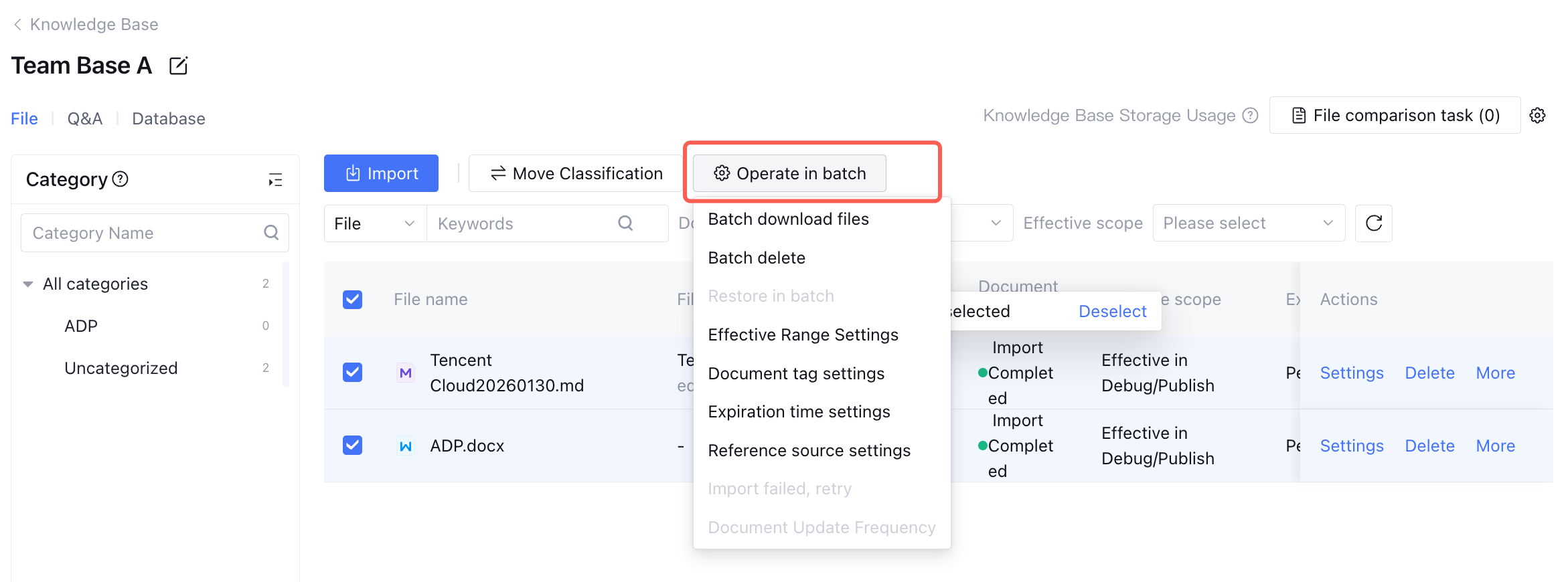 Select multiple documents and perform actions in bulk. For example, move them to a category for structured management, or batch set operations like download, delete, adjust tags, configure expiration dates, or set reference source display. This improves management efficiency for large-scale documents.