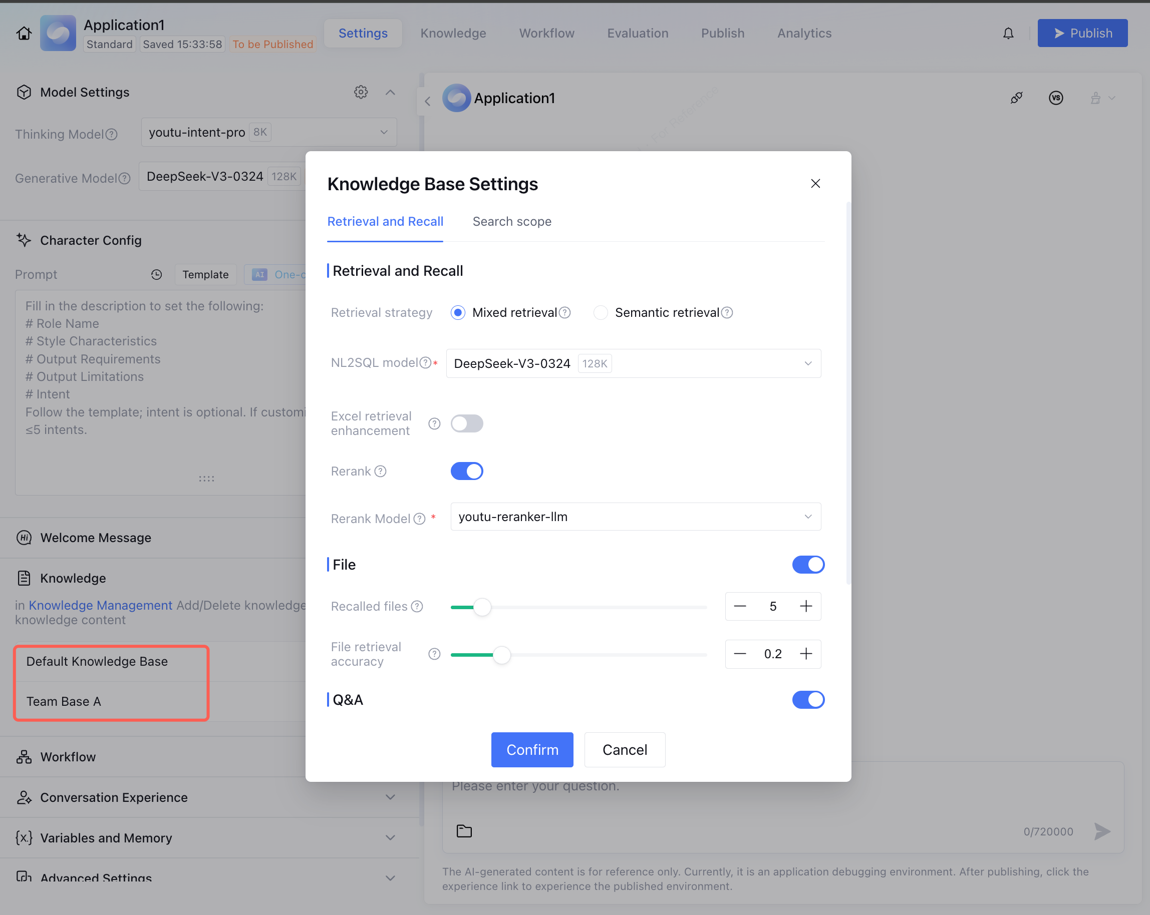 If you want to adjust the recall mechanism or search scope of the team-level knowledge base associated with the standard mode within application, please visit Application Settings > Knowledge Base Settings to make adjustments.
