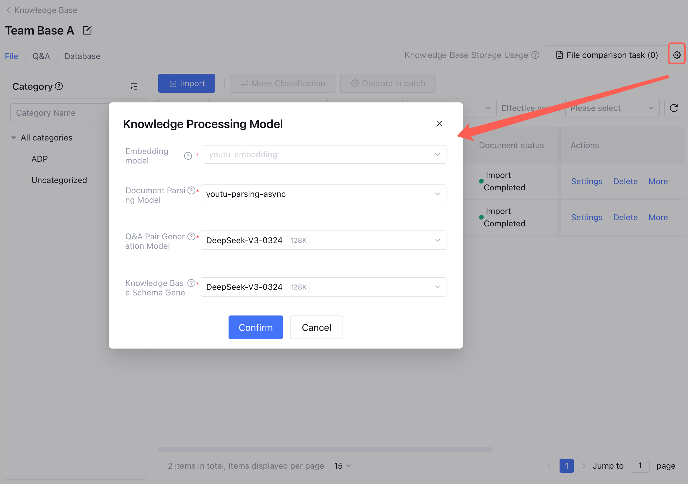 You can set the knowledge base and its knowledge process model uniformly in standard mode through the set button. The standard mode knowledge base supports setting vector model, QA pair generative model, and knowledge base Schema generative model. Go to Model Marketplace to configure a suitable model to meet needs in different business scenarios. 1. Embedding Model: The default model for knowledge base document Embedding processing. Both retrieving and importing knowledge base content use this Embedding model for vectorization processing. Tencent Cloud ADP currently only supports 1024-dimensional vectors. Once documents have been uploaded or an associated database is linked to the knowledge base, the vector model of the knowledge base cannot be changed. You can proceed to change the vector model only after the knowledge base content is cleared.