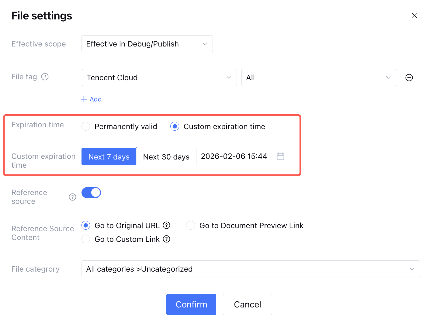 You can adjust a document’s expiration date. Once expired, the document cannot be used by agent applications. Options include 7 days, 30 days, or Custom. Click File Settings > Custom Expiration Time to adjust.