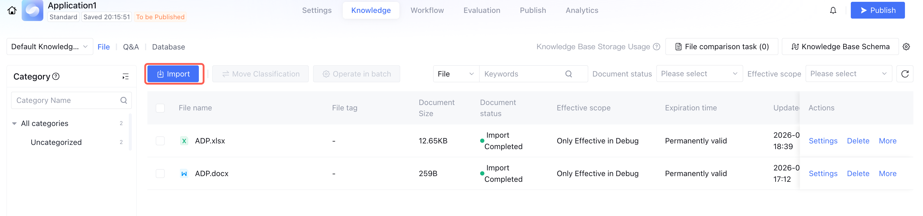 Knowledge Management is the feature entrance to manage knowledge base within application in a unified way. Each application has a default knowledge base, only available for this application, with no support for sharing across applications. If necessary, you can add platform-level knowledge base in Knowledge Management to reuse other knowledge content. You can also import File, generate Knowledge Base Schema or adjust Knowledge Base Settings, making it easy for Intelligent Agent to retrieve information more accurately. Adding Knowledge Base