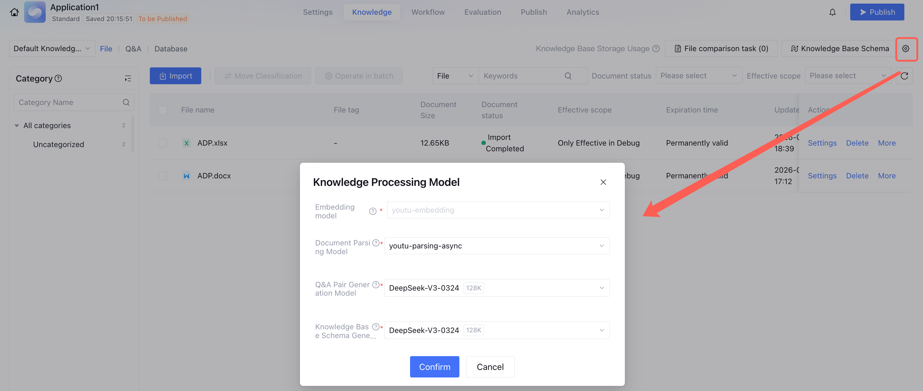 The stored data in the Knowledge Base is called knowledge, which includes File, Q&A, and Database. You can import documents, create Q&A or databases in the default knowledge base. The management module does not support modification of associated shared knowledge bases. If you hope to import more documents into the shared knowledge base, return to the Console, click on the left Knowledge Base, select target and import more knowledge. Adjusting Knowledge Base Settings