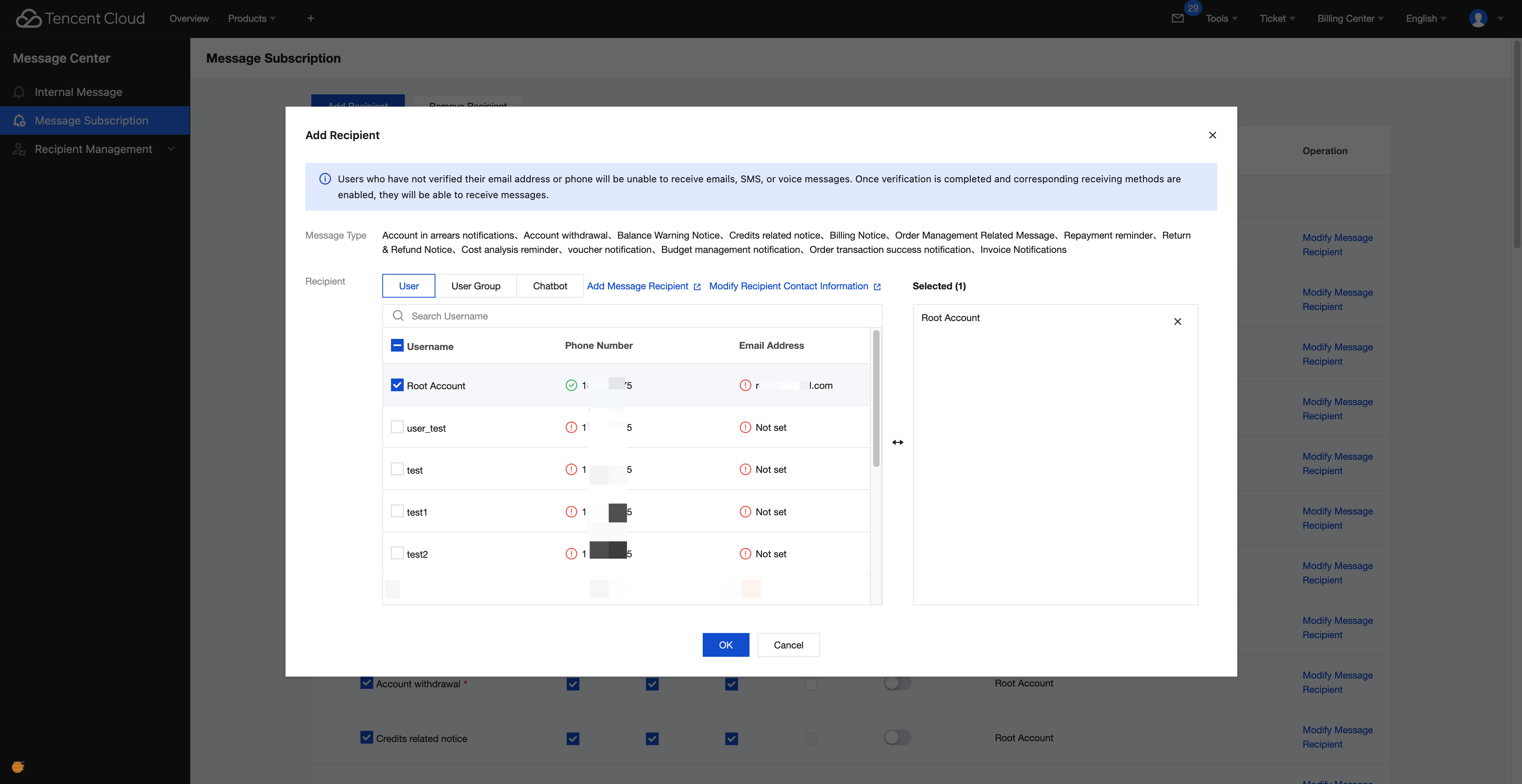 Tencent Cloud Subscription Notifications: Subscribe to official Tencent Cloud channels to receive notifications such as in-site messages, SMS, and email.