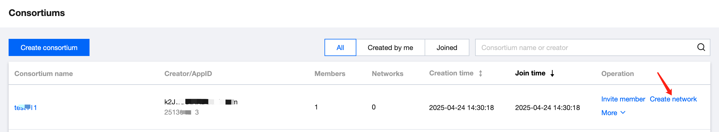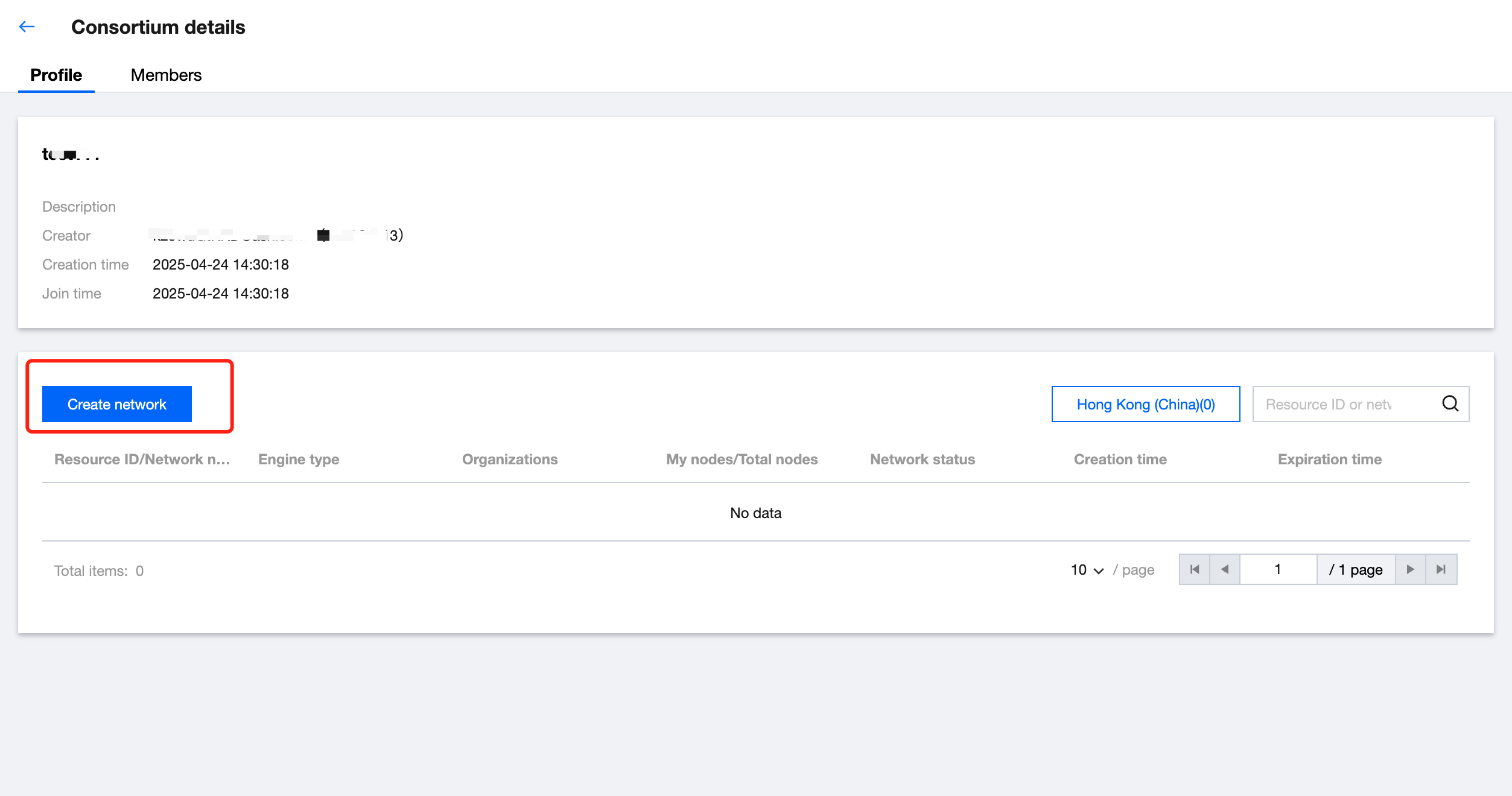 On the Consortium Details page, you can view the basic info of the consortium and the blockchain network info under the consortium. Click Create Network to create a blockchain network. As shown below: