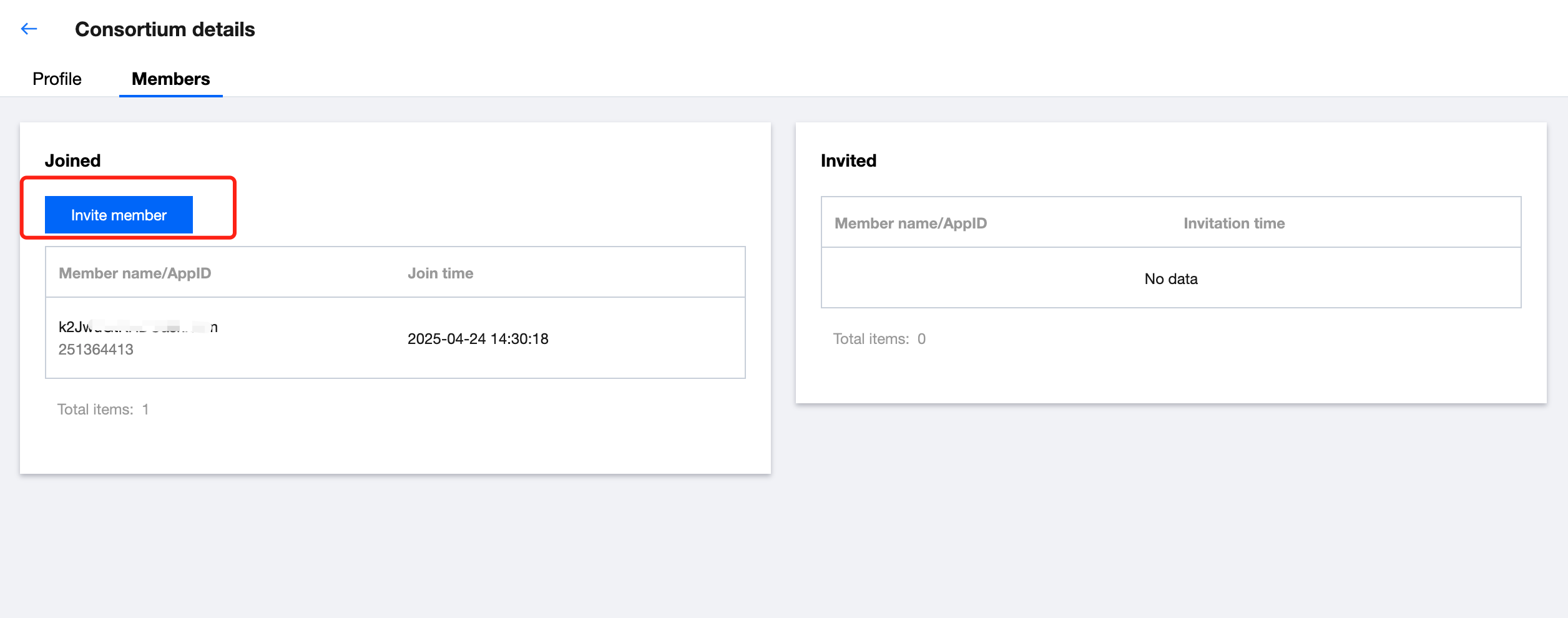 Select the Consortium Members tab to view the member information and members to be added of the consortium. Click Invite Members to invite members to join the consortium. As shown below: