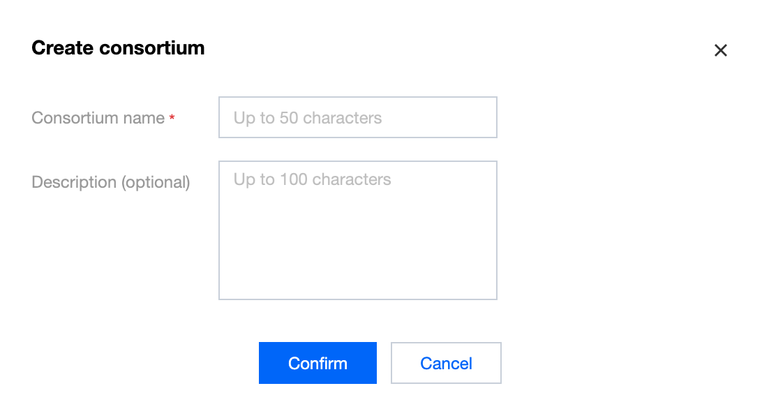 2. In the pop-up Create New Consortium window, refer to the following information to complete the form, and click Confirm to create a consortium. As shown below: