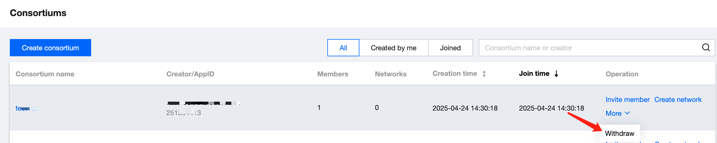 2. On the Consortium list page, select More > Exit the Consortium on the right of the consortium to be deleted. As shown below: