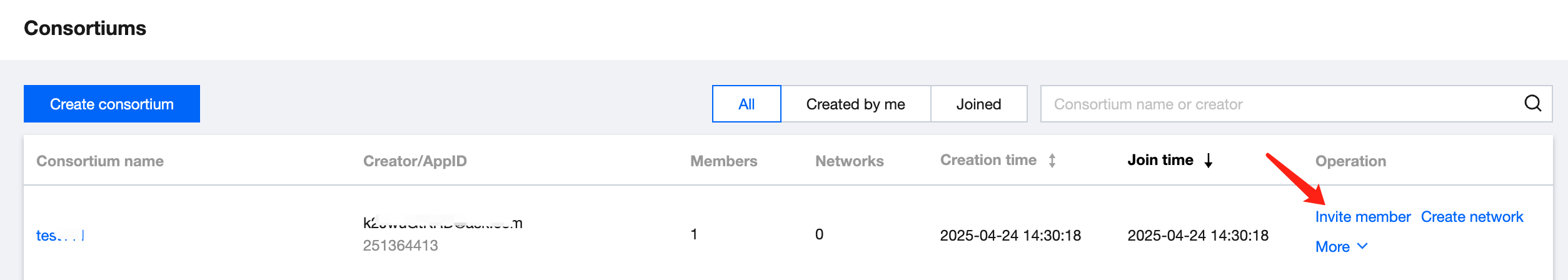 2. Click Invite Members on the right of the row where the consortium to invite members is located. As shown below: