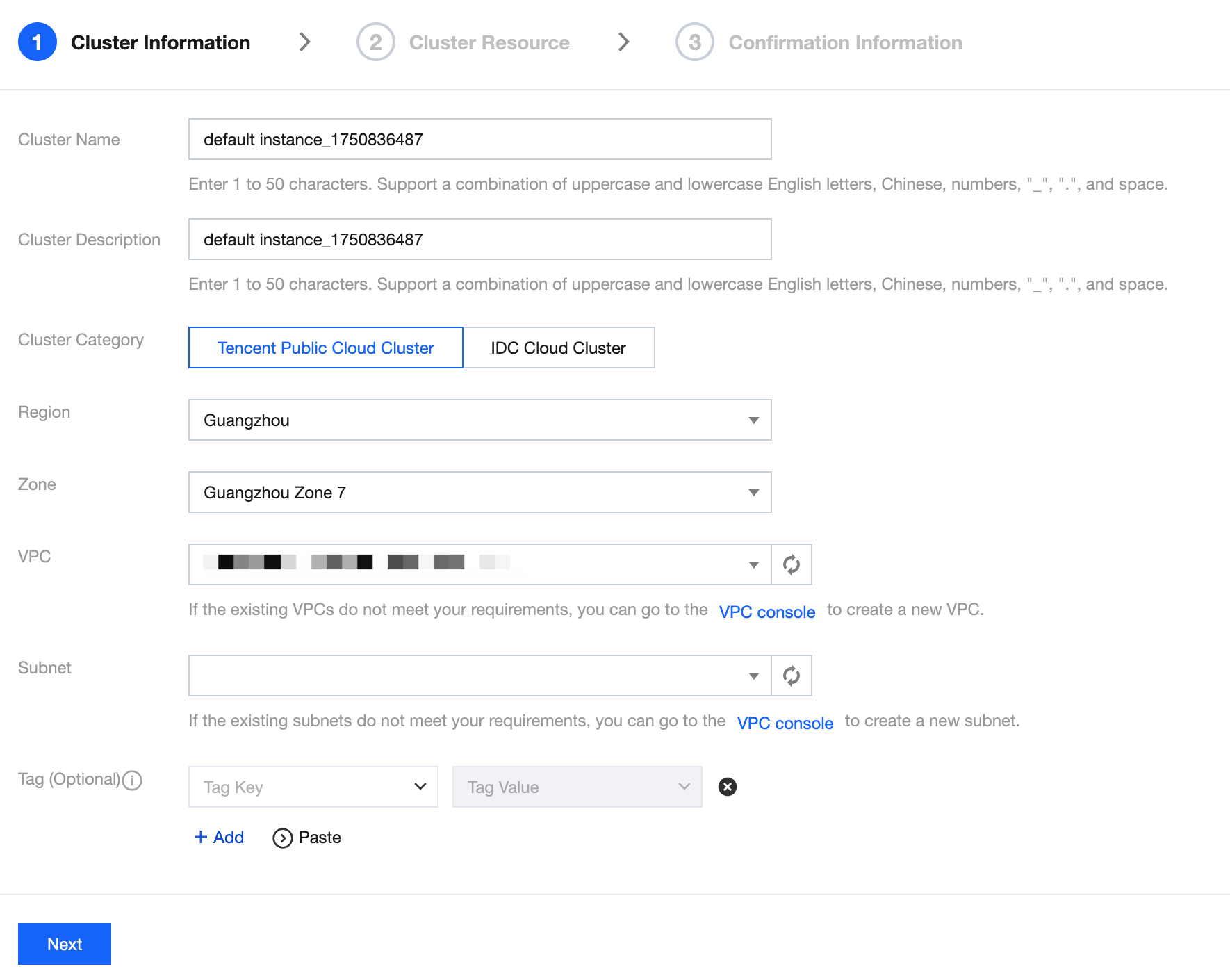 VPC: The VPC where the cluster is located, generally the same VPC as the computing cluster. Try to avoid cross-VPC deployment situations.
