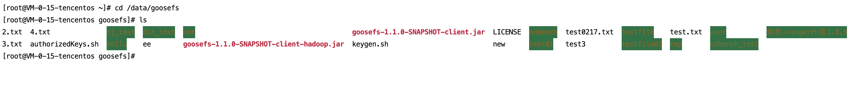 The bucket has been mounted on the corresponding Client node. Log in to node CVM, enter the local mounting directory /data/goosefs, and you can view all files in the associated bucket of the namespace.