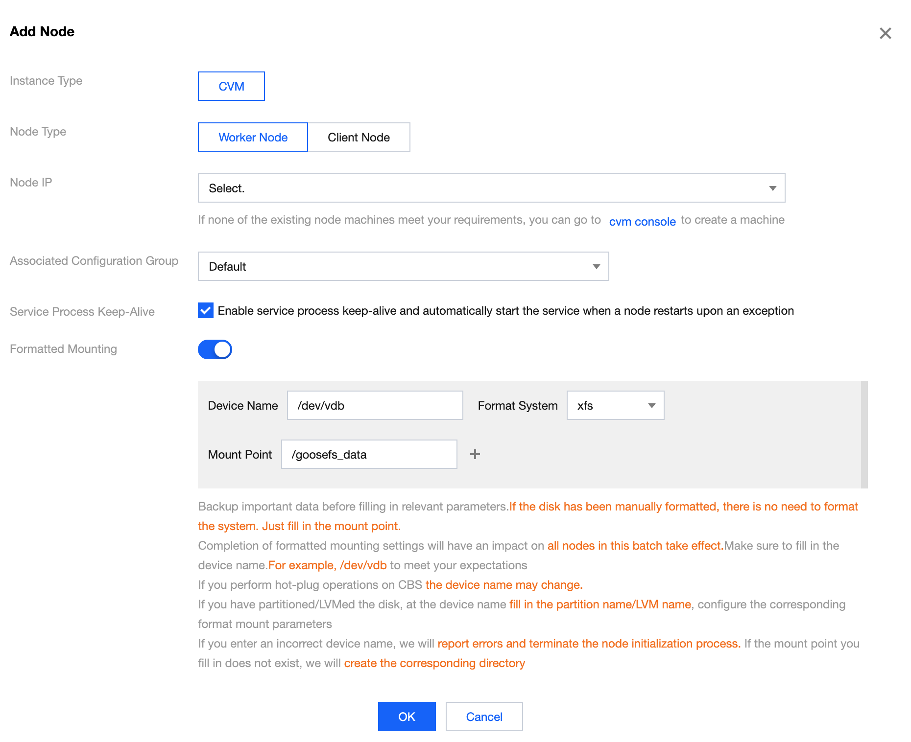 Formatted Mounting: Used to format the disk and perform file system mounting. Users can choose whether to perform formatted mounting. If not enabled, there is no need to set the data disk mounting option during the creation process; it can be mounted manually or using scripts. If enabled, the device name, system formatting, mount point, and other parameters need to be filled in.