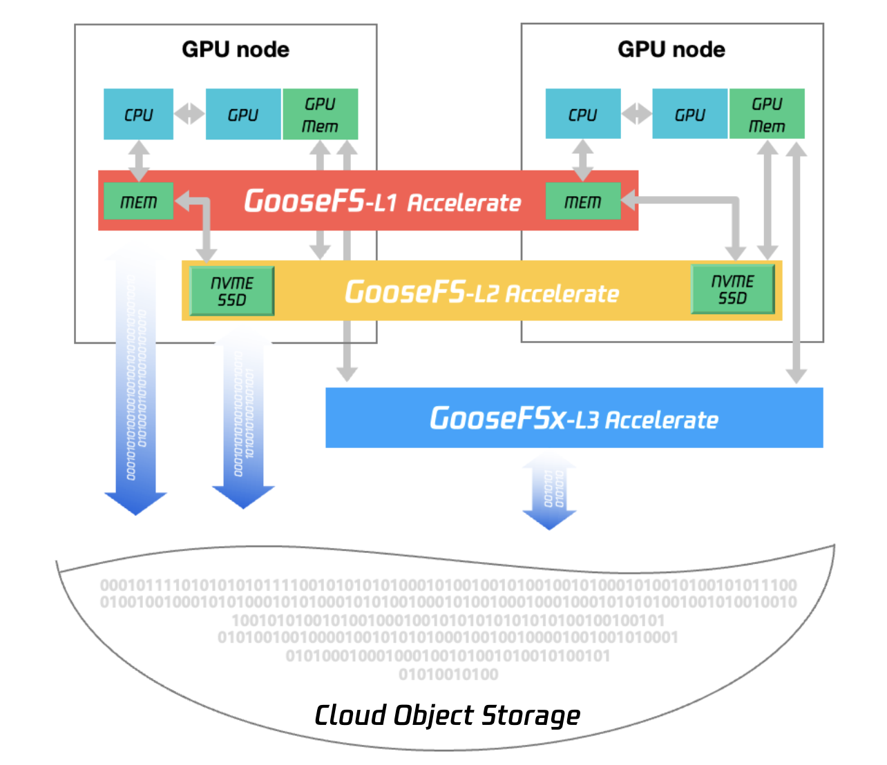 Local cache storage: GooseFS provides distributed cache capabilities through the physical media of Worker nodes. It supports caching data generated by computations on the local memory, disk, or AZ-level cloud disks of computing nodes. The cache capacity of each Worker node can be configured by the user themselves.
