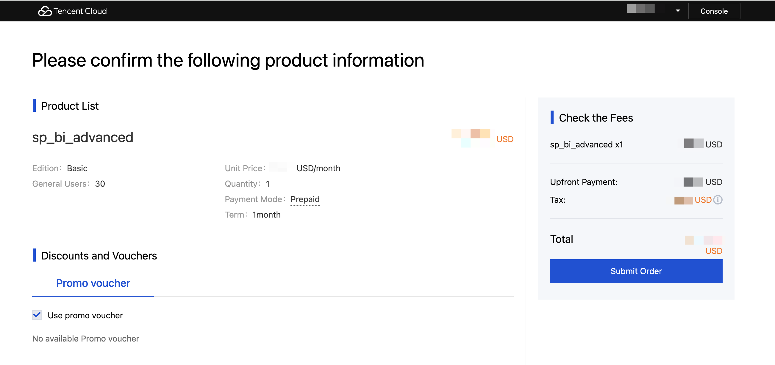 1. Log in to the BI console, then click Renew Now in the edition information on the right (This is a permanent entry. You can also trigger the renewal process through the entries provided for products that are about to expire or have already expired). 2. The current expiration time, new expiration time after renewal, and renewal cost will be displayed. Click Confirm Renewal to go to the order confirmation page. 3. On the order confirmation page, you can further confirm your renewal content and cost, and choose whether to use the promo voucher in your account. After confirming that the information is correct, click Submit Order to make a payment. 4. After the successful payment, you will go to the following page. The renewal process is now completed. Click Enter Console to be redirected to the BI console and continue to use the product.