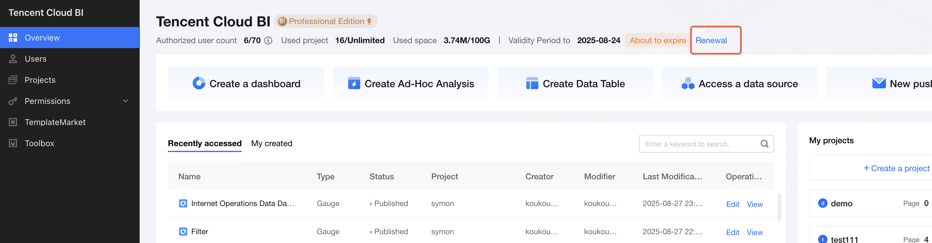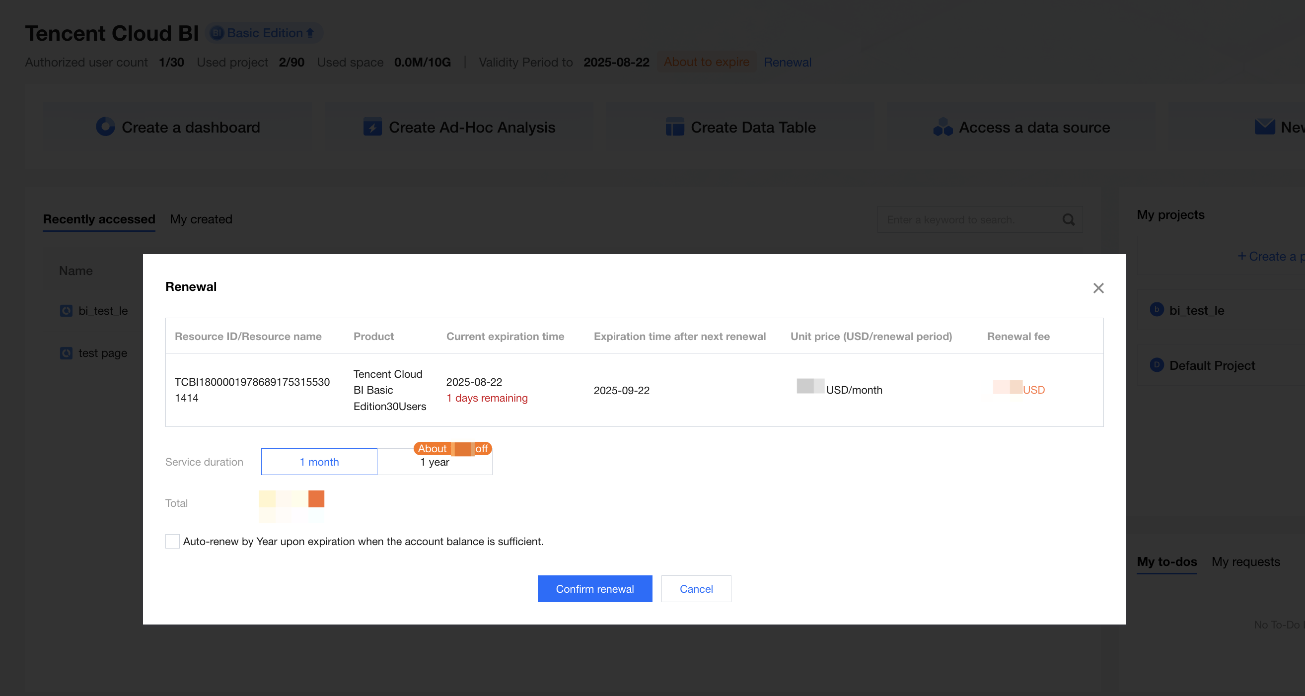 Tencent Cloud Business Intelligence (BI) allows users to renew based on their business needs, extending the product usage period.