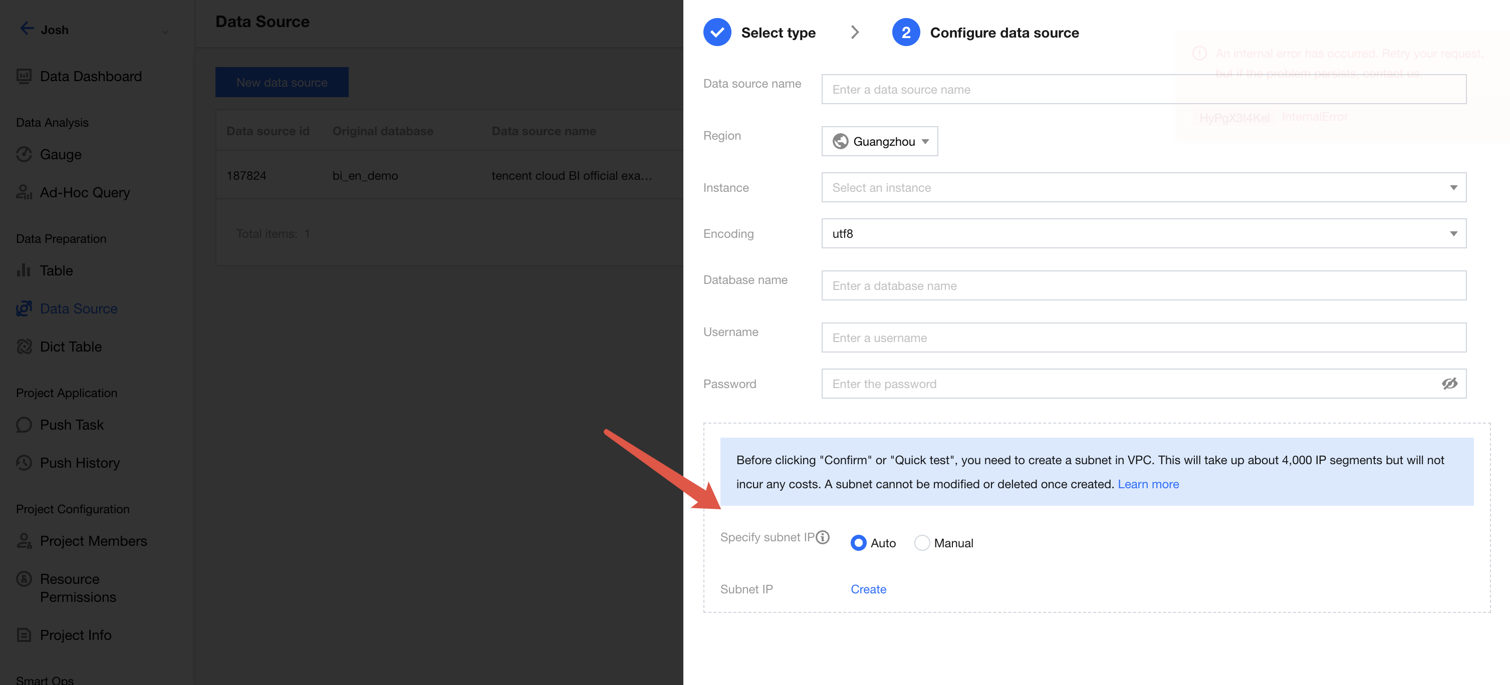 This subnet is only used by BI for database connections. Other internal services cannot access your internal space, and BI can only access the instance address that you have authorized. Any external traffic from Tencent Cloud cannot access this network. Therefore, you can create this subnet with confidence. At the same time, you need to set the security group, route, and other settings to allow the IP range of the subnet to access the database instance address. Without these settings, BI will not be able to successfully connect to your instance and obtain data.