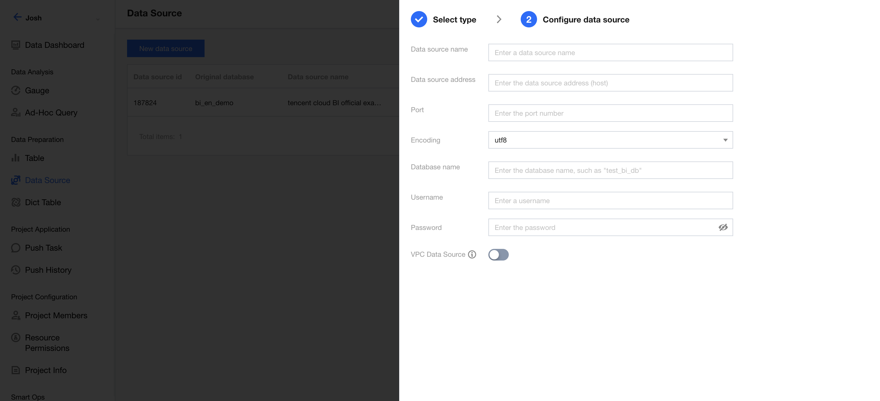 Data source address: The IP address of the database, such as a public network IP address in the format of cdb-2dhmvx6s.bj.tencentcdb.com. Private network IP addresses such as 49.232.129.87 are not supported. If the database is purchased on Tencent Cloud and is a cloud database supported by BI, refer to "Data Access - Cloud Data Sources" for connecting. If it is a cloud database not supported by BI, you can open the specified public network IP address and connect through your proprietary data source.
