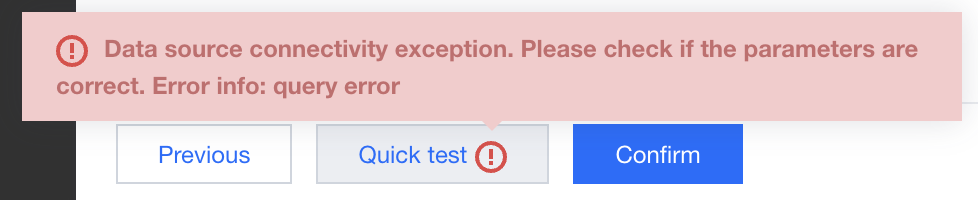 After entering the information, you can click One-click Testing at the bottom to perform a connectivity test. If the prompt "Data source connectivity exception" appears, the connection fails. At this point, first check whether the username, password, or other connection information is entered correctly.