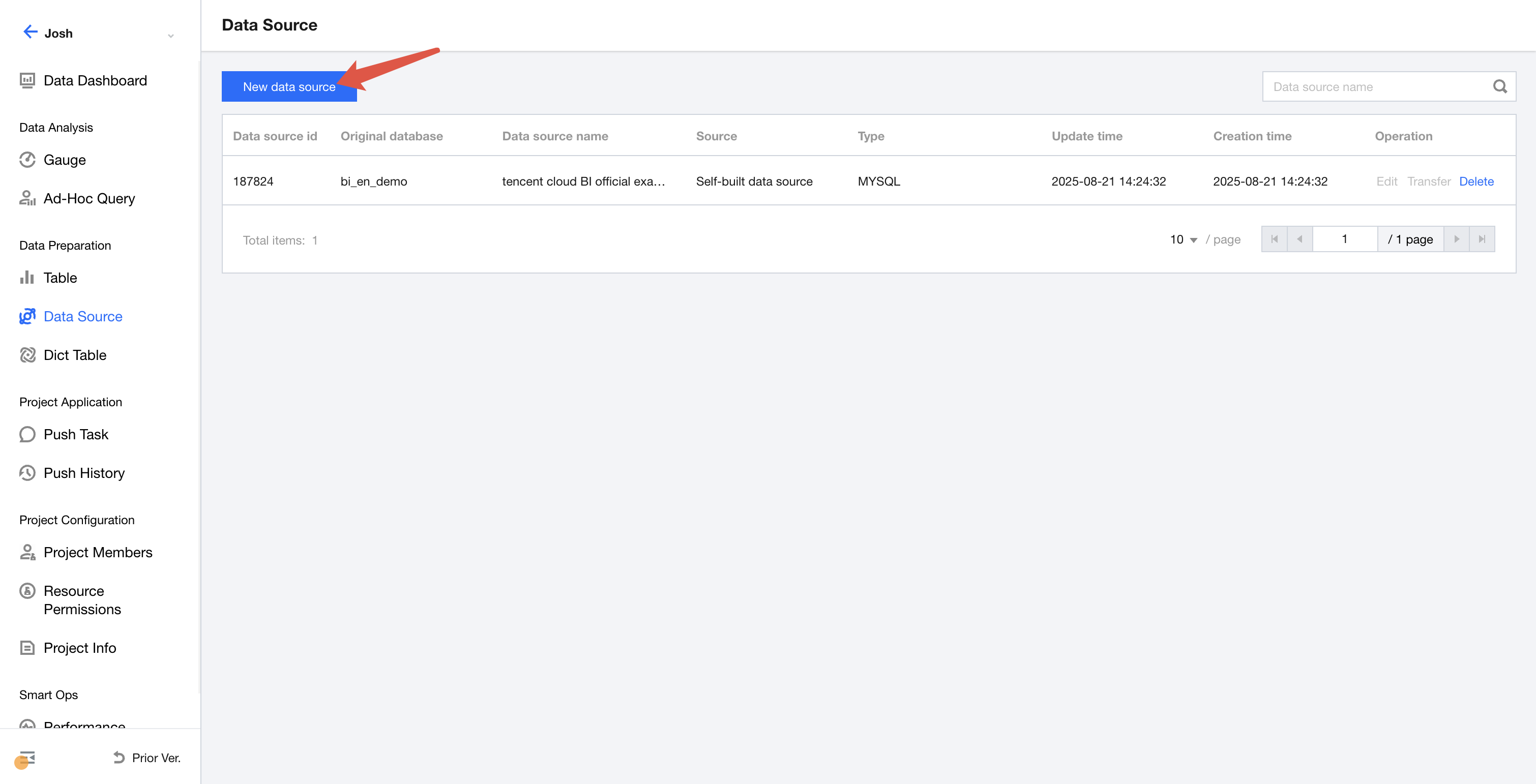 After creating a project, select Data and then Data Source, then click "Create Data Source".