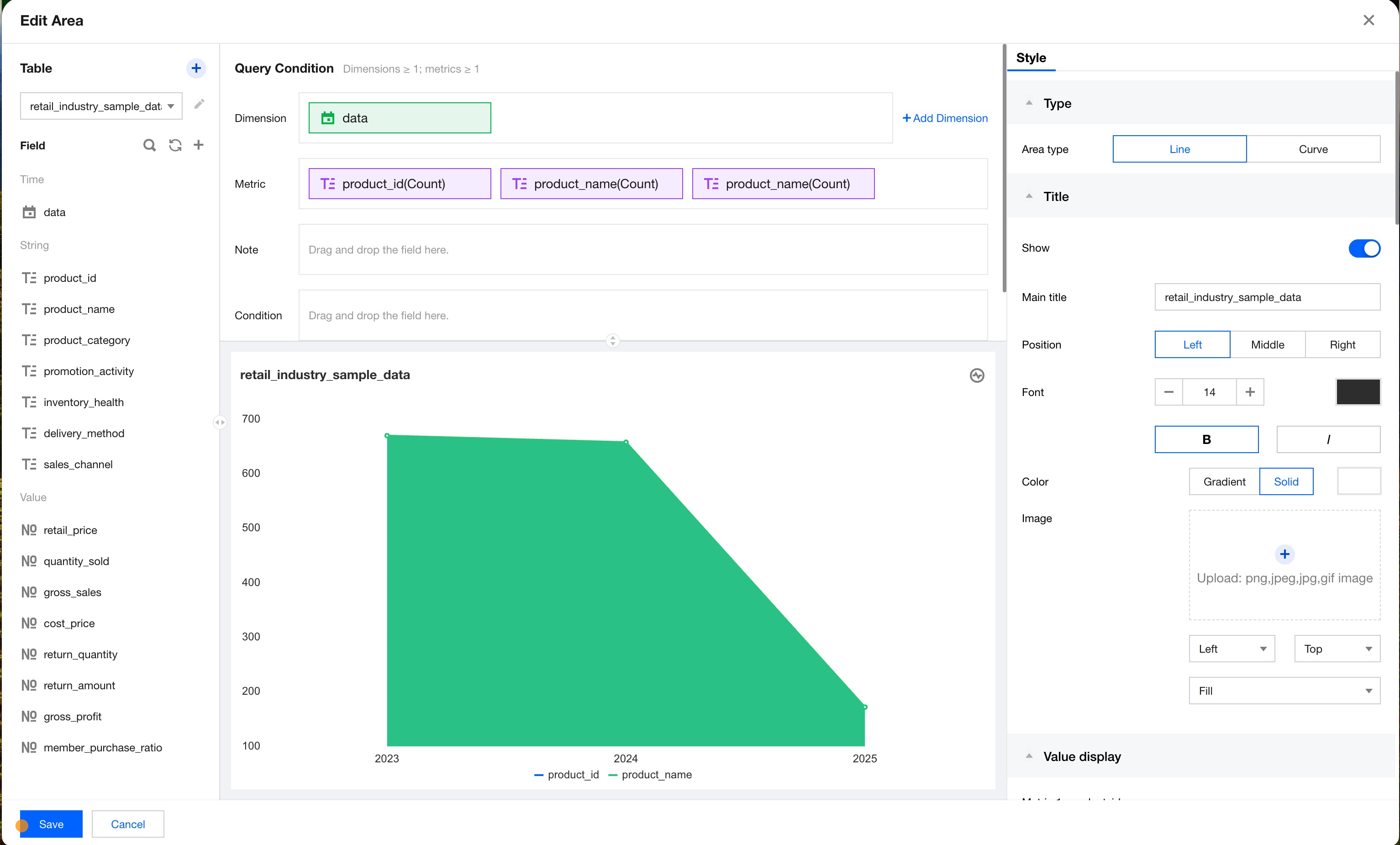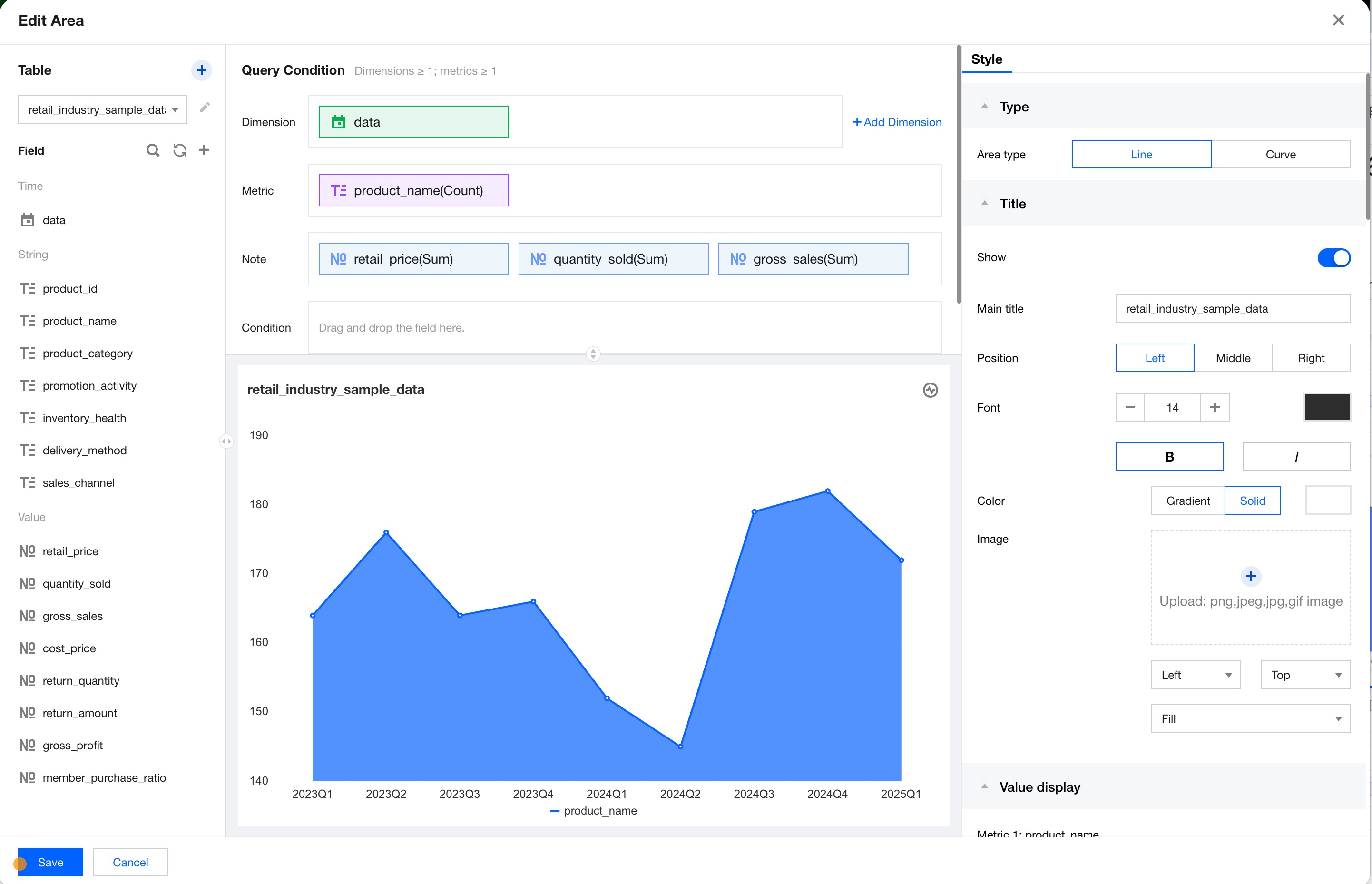 Note: The display functionality for auxiliary information will show the field information dragged into the prompt query condition in a pop-up dialog box when you hover the mouse over a chart data point. These fields will not affect the main visual representation of the chart but provide valuable context information.