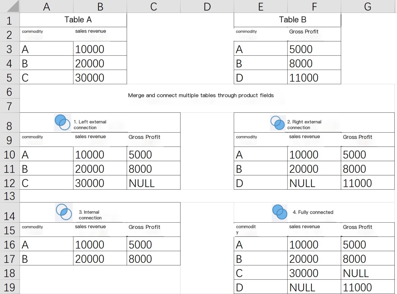 4. Full join: A combination of left join and right join that contains all data from both the left table and the right table. Unmatched data is displayed as null.