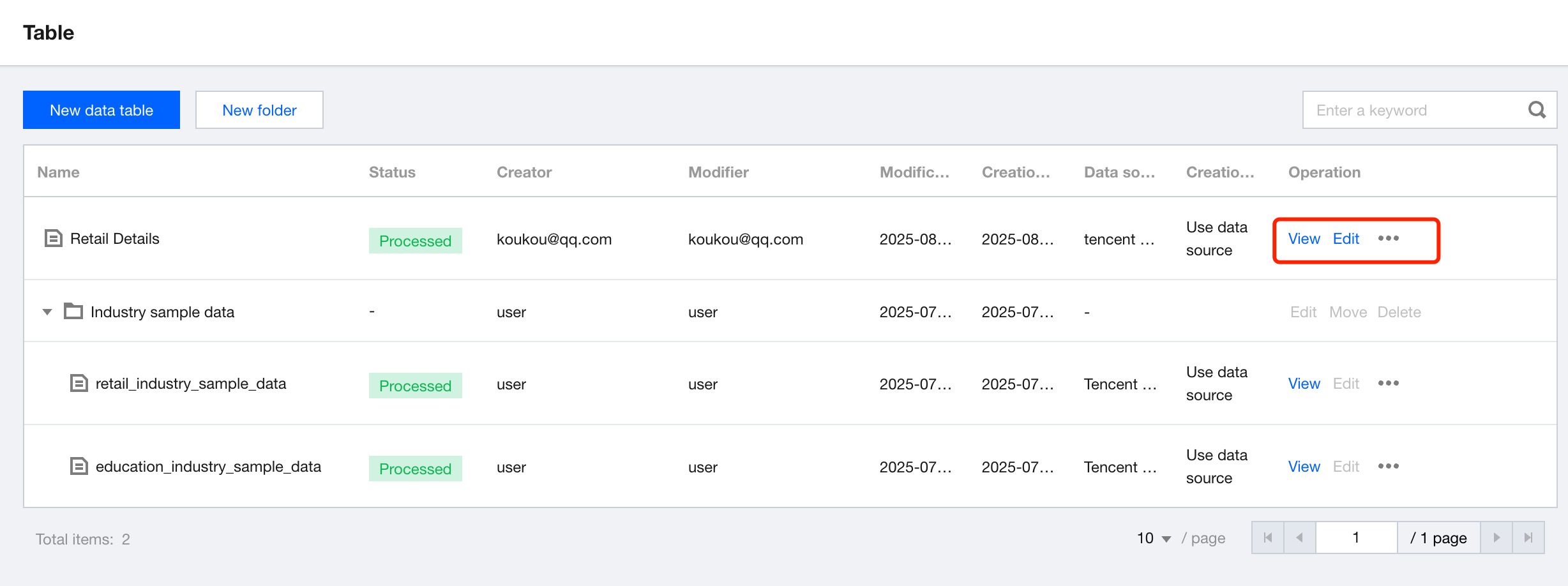 Edit: Click to edit a data table, including new data table parameters and field configuration information.
